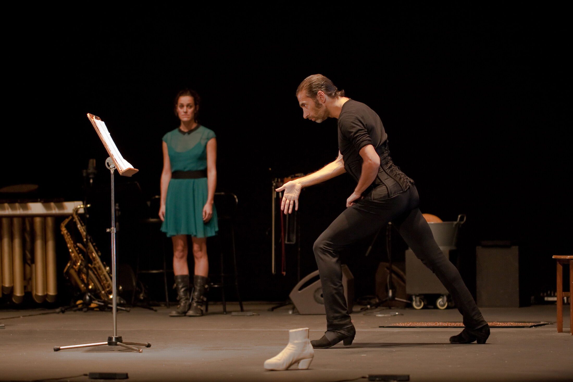 Mais reprenons au commencement. Galvàn arrive sur scène, vêtu de noir, portant une chose qui tient du vertu-gadin et du corset orthopédique, avec la jeune Eloisa Cantón, bottes marron et robe courte vert d'eau. Sur scène, une bottine blanche, esseulée, et un pupitre portant un cahier. Le noir n'est pas fait dans la salle et un préambule drôlatique peut commencer. Galvàn effeuille son cahier en lançant des anathèmes sur le flamenco rigoriste, institutionnalisé, figé, sans imagination. Pour finir, il fait un sort à la bottine blanche qui est de plâtre. Le noir se fait et son hymne à la liberté peut commencer. Mise à part une séquence très free jazz dans le noir absolu, qui m'a laissée rêveuse, tout est bien. Une mention particulière pour l'alegria, jouée par Caracafé, puis chantée par David Lagos et Tomas de Perate, puis jouée au xylophone par Antonio Moreno, qui s'enchaine glissando sur un pasodoble joué par le saxophoniste Juan Jimenez Alba. S'ouvre alors une parenthèse sur la culture andalouse, avec l'évocation des grands toreros Juan Belmonte ou Joselito. Un autre moment de grâce est cette danse accompagnée par une corne au son nasillard. Elle serait d'un village de la région de Huelva, mais elle évoque furieusement le fandango, danse emblématique du Pays basque. Juan Jimenez Alba, au son de cet instrument bizarre, fait danser les six autres, en ligne et face à face, comme sur la place du pueblo.