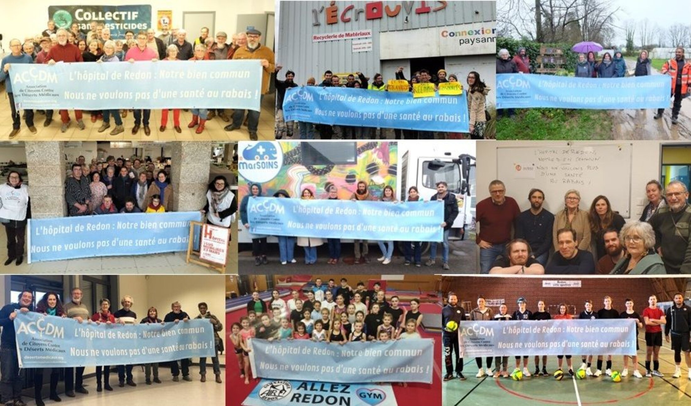 L’Agence régionale de Santé de Bretagne (ARS) fait pression depuis de nombreuses années auprès des élus et de la population du Pays de Redon pour qu’elle accepte un nouvel hôpital au rabais, avec une superficie réduite et une perte de lits d’hospitalisation, alors même que l’ARS avait défendu l’idée de la reconstruction d’un nouveau bâtiment de 14 000 m² il y a quatre ans. Pour contester ce projet, un comité d’appui de l’Hôpital rassemble les élus locaux, les parlementaires, des représentants des personnels et des usagers. La population dans son ensemble s’est fortement mobilisée pour montrer son refus unanime de ce projet d’hôpital au rabais, en recourant à une diversité de modes d’action (pétition, manifestations, Randos militantes, photographies des associations avec une banderole, Chanson filmée des agents hospitaliers, etc.).