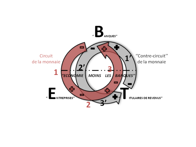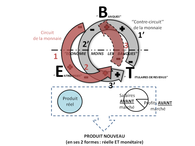 C’est là où ce que l’on peut comprendre (et qu’il est absolument ESSENTIEL de comprendre !) c’est que, lorsqu’elle ‘’finance’’ la production avec un prix (étant entendu qu’en réalité, elle la monétise -ce est tout autre chose !), la création monétaire ne peut certainement pas être portée au crédit des ‘’BANQUES’’ : conceptuellement, la création monétaire ne se fait-elle pas À ÉGALITÉ sur les TROIS pôles du circuit que sont les ‘’BANQUES’’, les ‘’ENTREPRISES’’, et les ‘’TITULAIRES DE REVENUS’’ ?