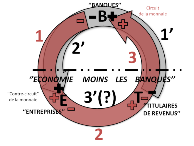 C’est précisément à cet endroit que, transcendant les ‘’ENTREPRISES’’ et les ‘’TITULAIRES DE REVENUS’’, l’institution (l’INSTITUTION !!!!) des ‘’BANQUES’’ change absolument tout : E donnant à T et, ‘’en contrepartie’’, T lui redonnant par l’intermédiaire de B, le résultat de ces deux opérations peut, sans contradiction, être positif ; en effet, ce qui circule de E vers T peut alors être cela même qui circule de T vers E (puisque, la circulation de T vers E se faisant alors par B, cette circulation se fait dans le même sens que lorsqu’elle se fait de E vers T).