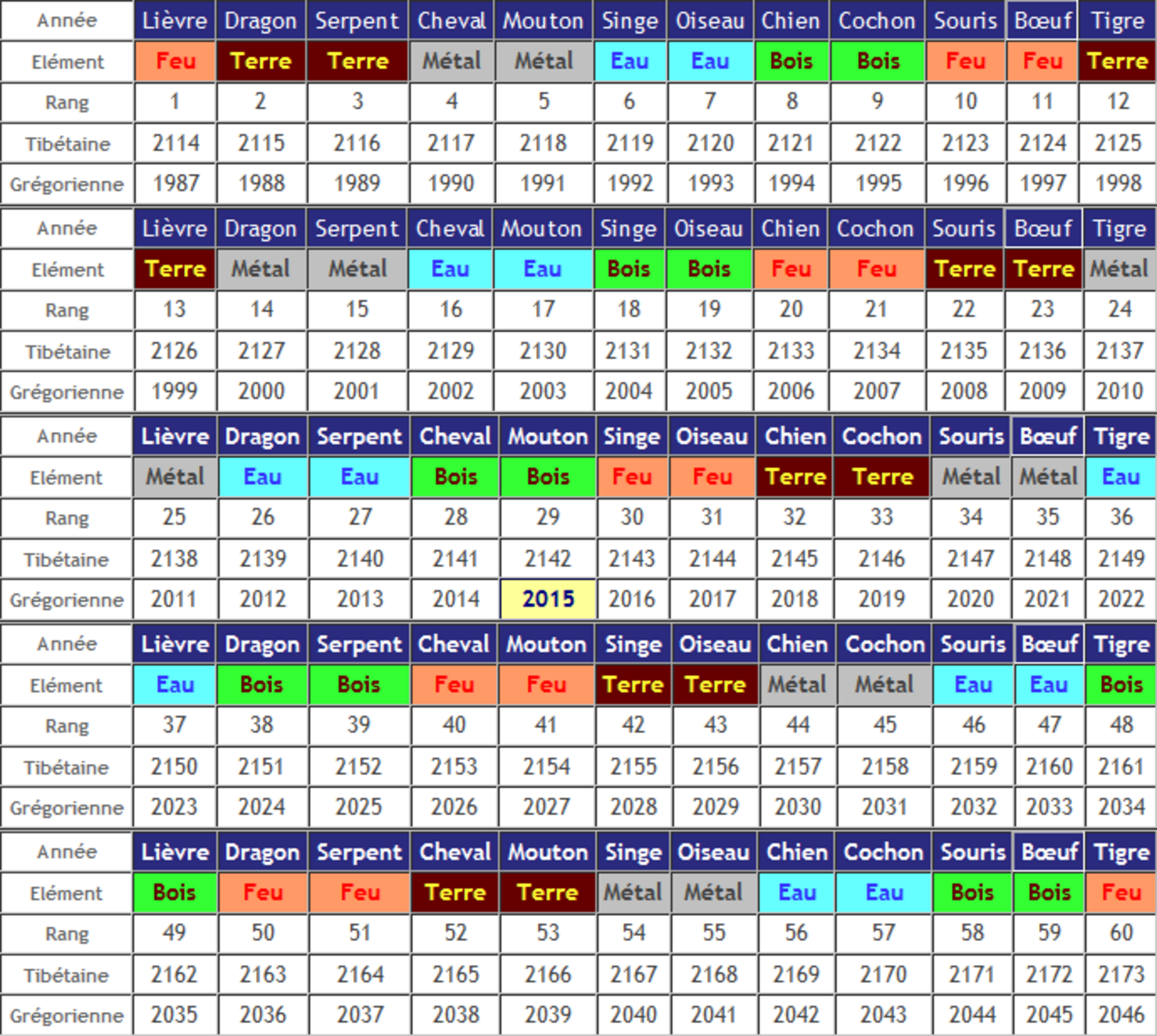 et les 5 éléments, chacun répété 2 ans de suite :