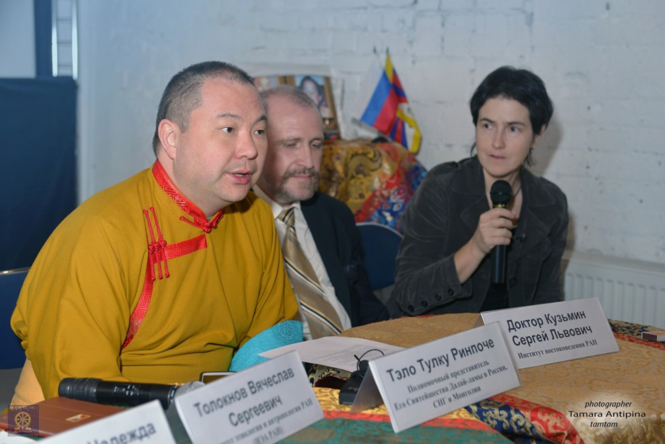 Telo Tulku Rinpoche, représentant honoraire de Sa Sainteté le Dalaï-Lama en Russie et en Mongolie; Dr Sergey Kuzmin L., de l'Institut d'études orientales de l'Académie russe des sciences, auteur du livre « Invisible Tibet: Histoire de l'Indépendance et de l'occupation ».
