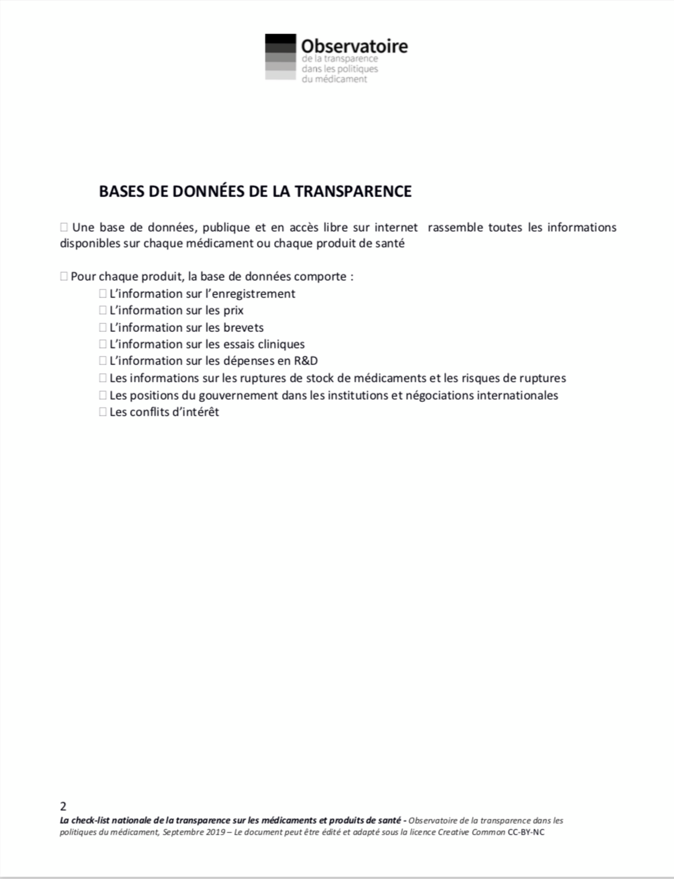 Les bases de données mentionnées ci-dessous doivent être en accès libre et leur contenu doit être systématiquement vérifié par des agents publics avant leur publication, en particulier si l’information provient d’entités privées.La mise en œuvre de la check-list de la transparence peut contribuer à façonner les politiques de santé publique, de recherche et développement et de propriété intellectuelle, avoir un impact sur les négociations de prix des médicaments, et en définitive bénéficier à l’accès à la santé des populations et protéger et renforcer les systèmes de santé publique basés sur la solidarité.