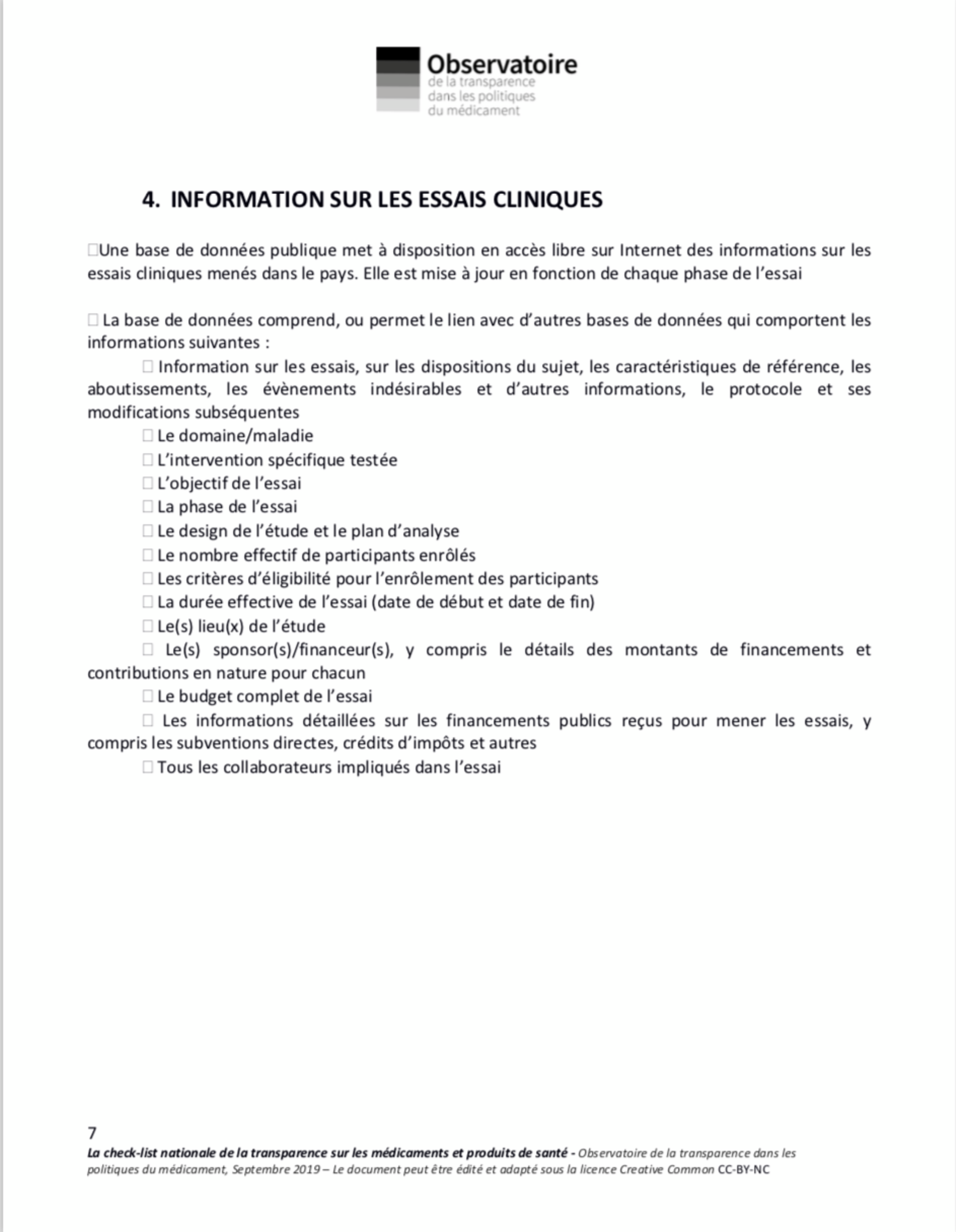 La « check-list nationale de la transparence sur les médicaments et produits de santé » a été développé par l’Observatoire de la transparence dans les politiques du médicament en août 2019.