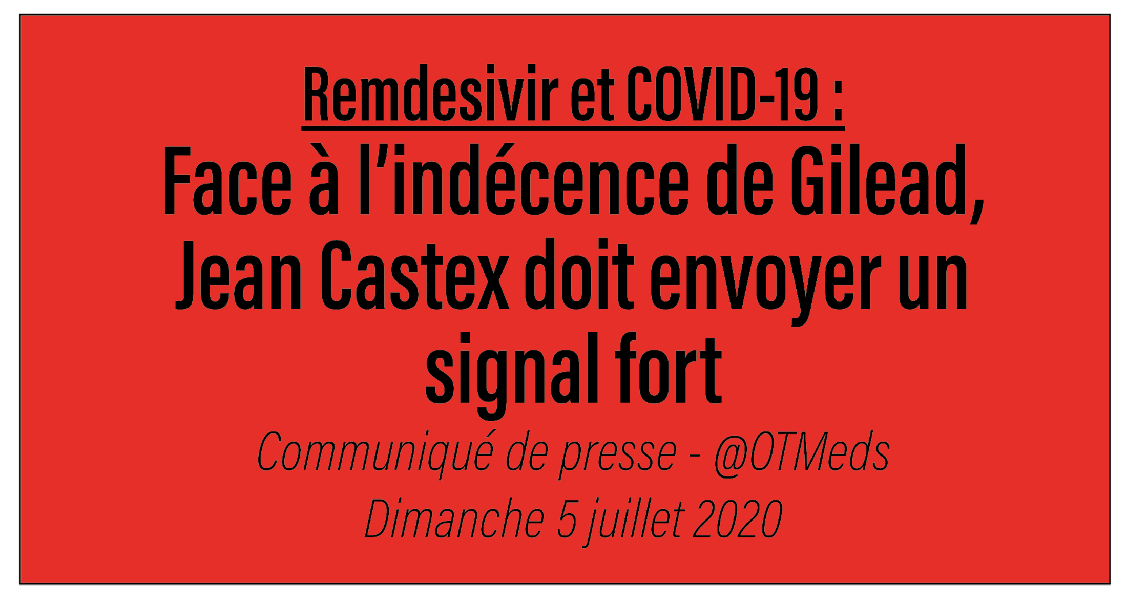 Le 25 juin 2020, l’Agence Européenne du Médicament (EMA) a recommandé, sous conditions, l’autorisation de mise sur le marché (AMM) du remdesivir dans le cadre de la prise en charge du COVID-19. Depuis, les annonces se sont multipliées : accaparement par les États-Unis de la quasi-totalité des stocks pour trois mois, prix annoncé par Gilead d’environ 2300 dollars (2045 €) par personne alors que le coût de production estimé est de 75 centimes de dollars (0,67€) par jour et par personne, pour un traitement utilisé pour une durée de 10 jours dans le cadre d’essais.