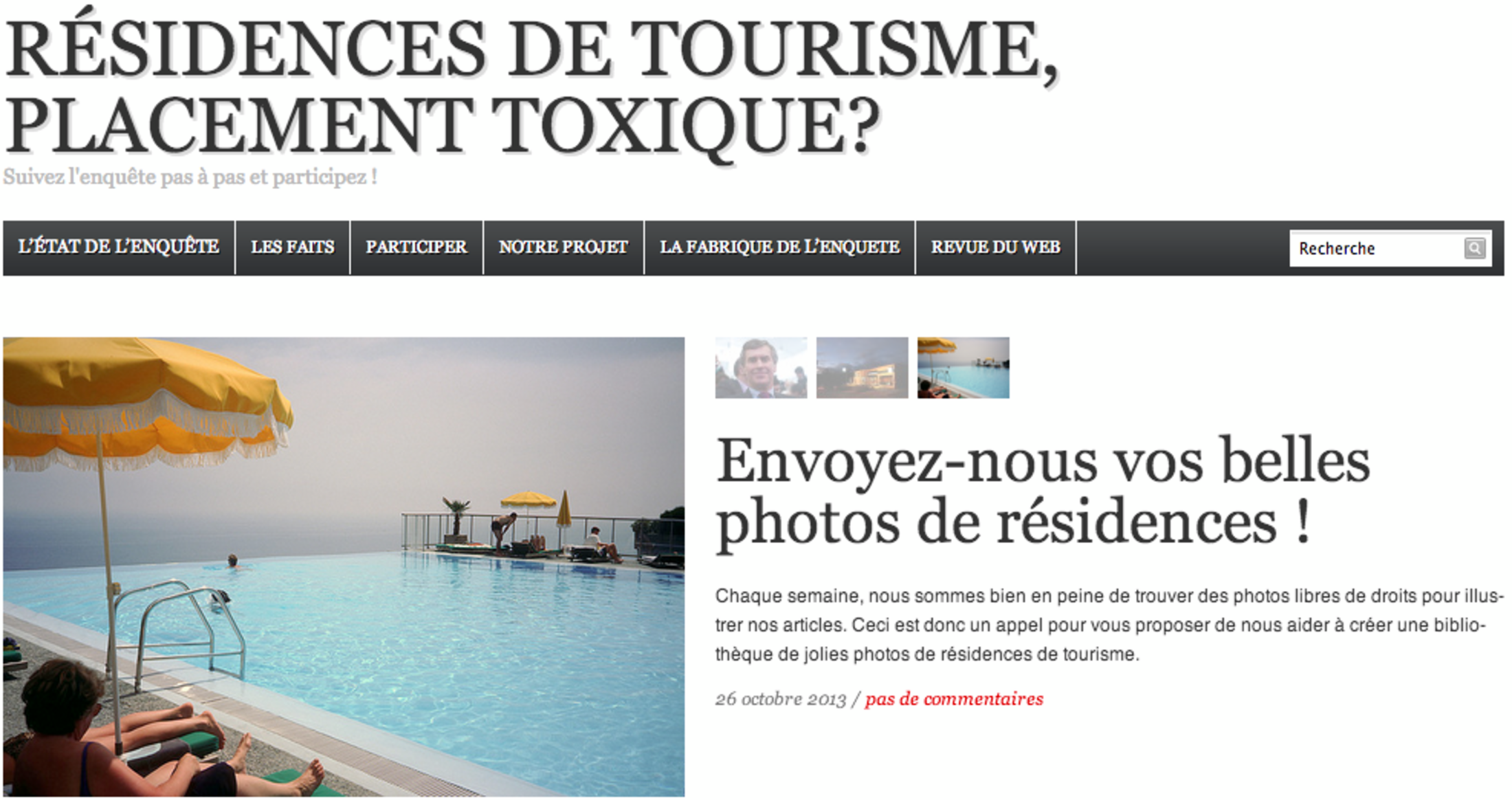A l'unanimité, le jury a choisi ce dernier projet comme lauréat du deuxième Labo de l'Upic. La première enquête participative, « Résidences de tourisme, placement toxique ? », démarrée en mai 2013, illustre bien la démarche des cinq fondateurs, tous journalistes pigistes et membres du collectif Les incorrigibles.