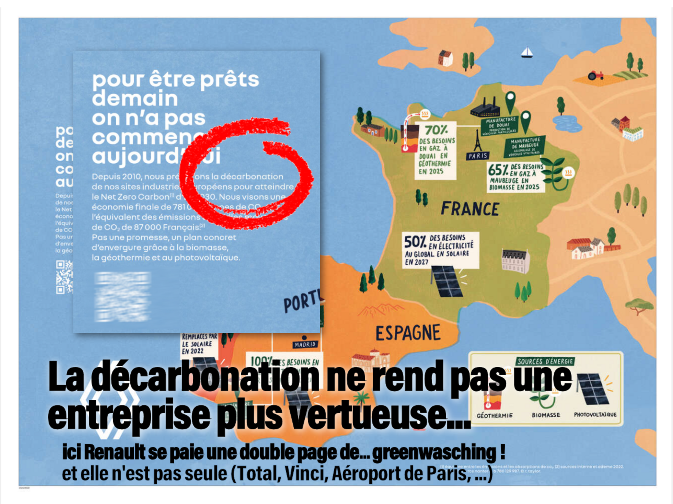 La double page que se paie Renault dans la presse régionale est ce que l'on appelle "une opération de greenwashing" ou comment faire croire à l'opinion publique que l'on est écologiquement responsable, alors que la réalité est loin de l'être. Non, décarboner son entreprise, ne la rend pas vertueuse pour autant.