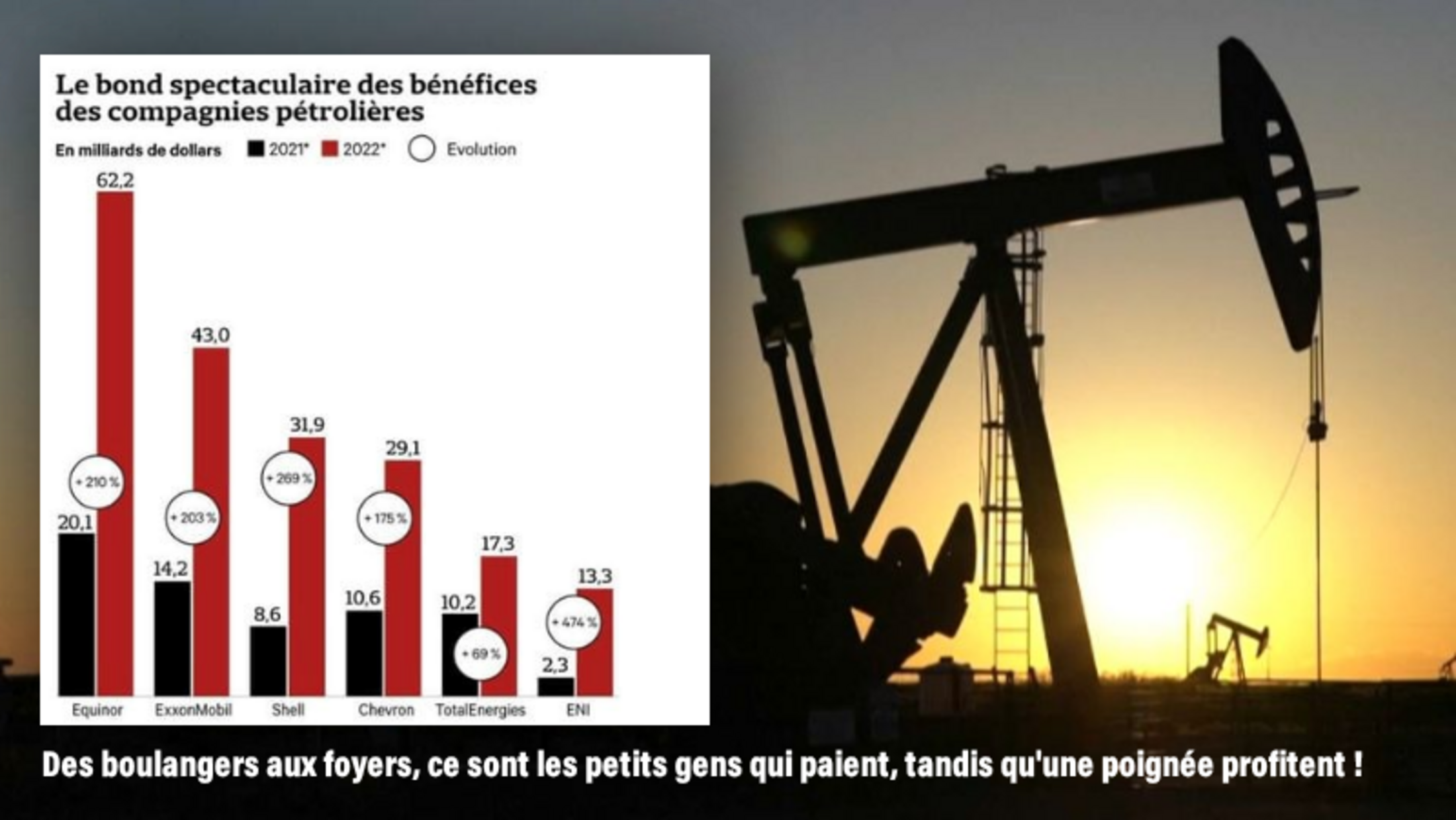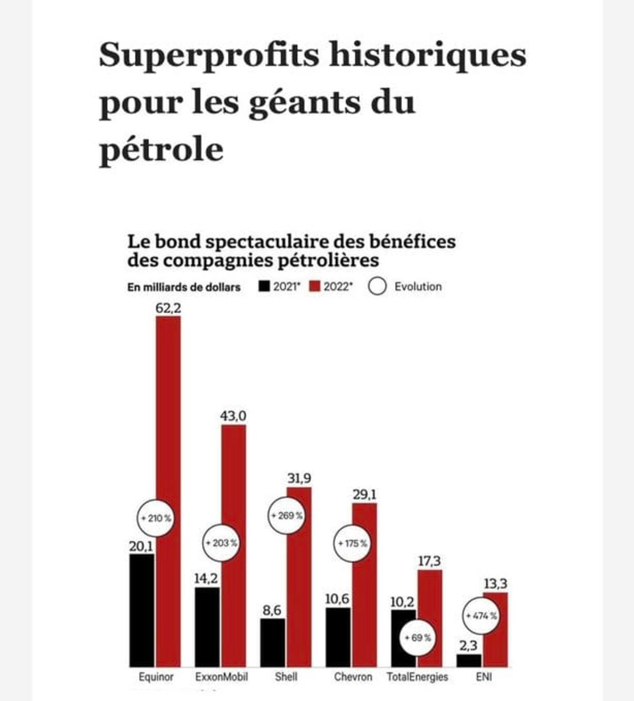 - – il y a ceux qui engrangent les #Superprofits : plus de 200 milliards (mds) de dollars en 2022 (188 Mds d'€) pour les géants du pétrole comme ExxonMobil, Shell, TotalEnergies, Chevron, etc.