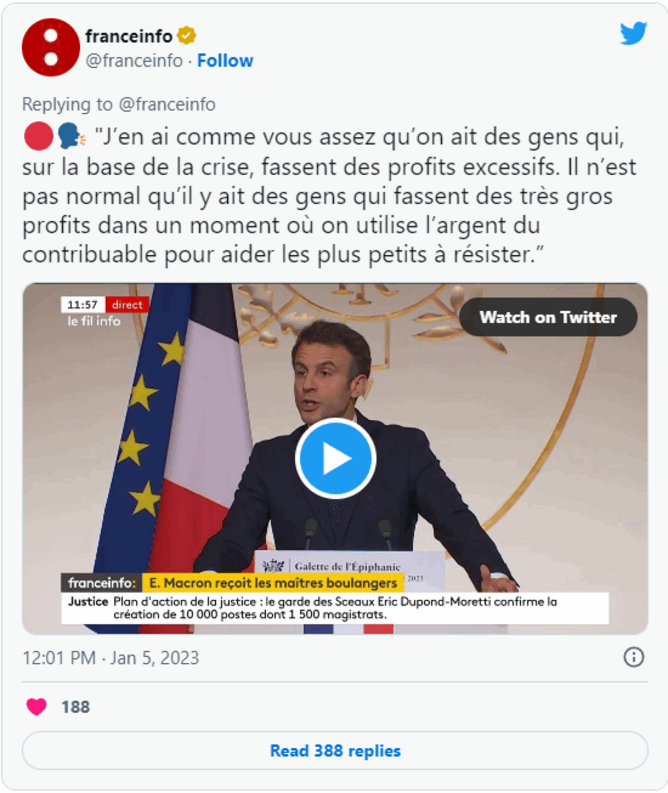 qui dénonce les profiteurs de guerre en juin 2022, mais refuse de les taxer comme il se doit à l'automne puis, en janvier 2023, fait à nouveau mine d'en « avoir assez » de ceux qui « font des profits excessifs » (1).