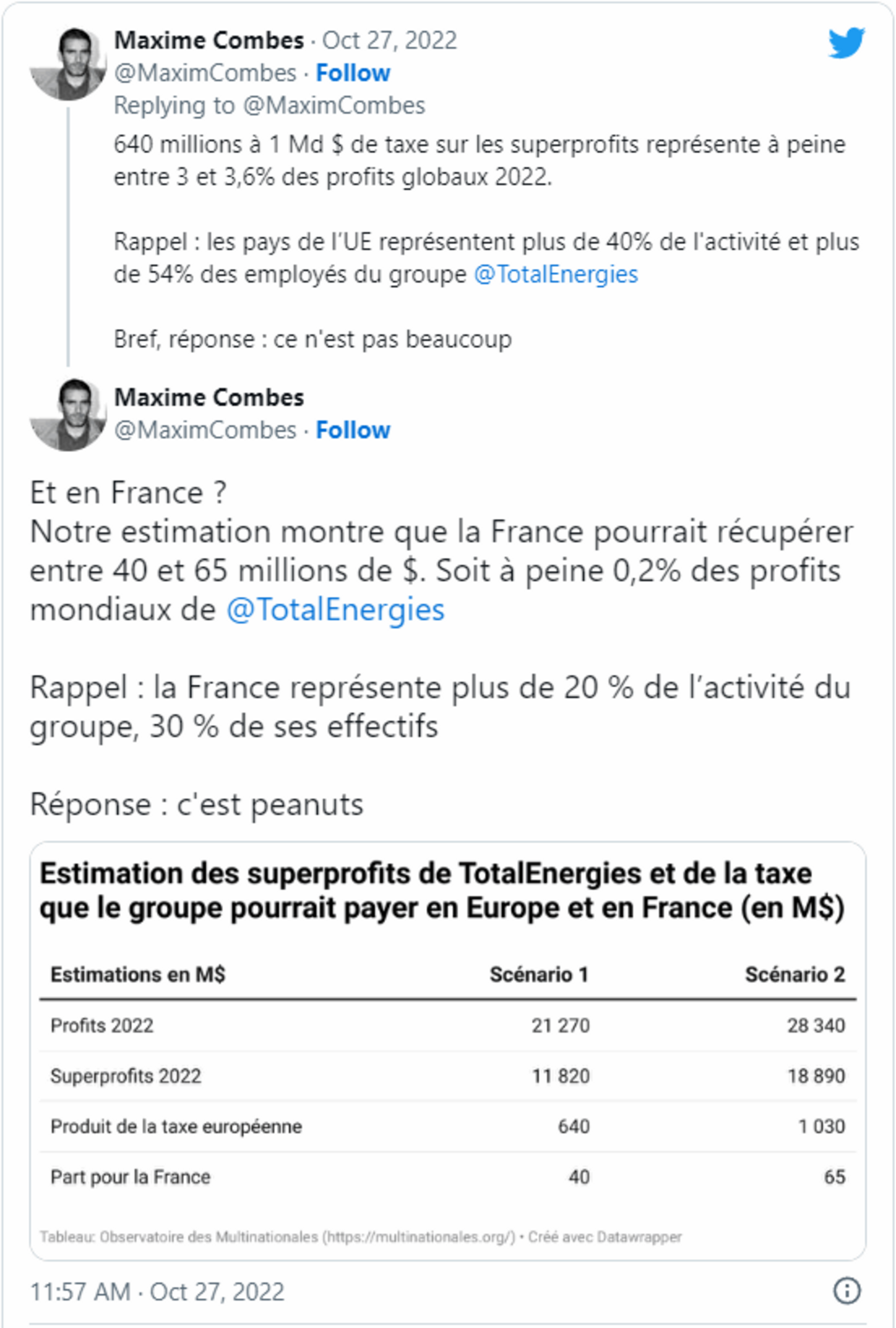 Selon, l'économiste Maxime Combes, « notre estimation montre que la France pourrait récupérer entre 40 et 65 millions de dollars, soit à peine 0,2 % des profits mondiaux de TotalEnergies ». En rappelant que la France représente plus de 20 % de l’activité du groupe et 30 % de ses effectifs (2).