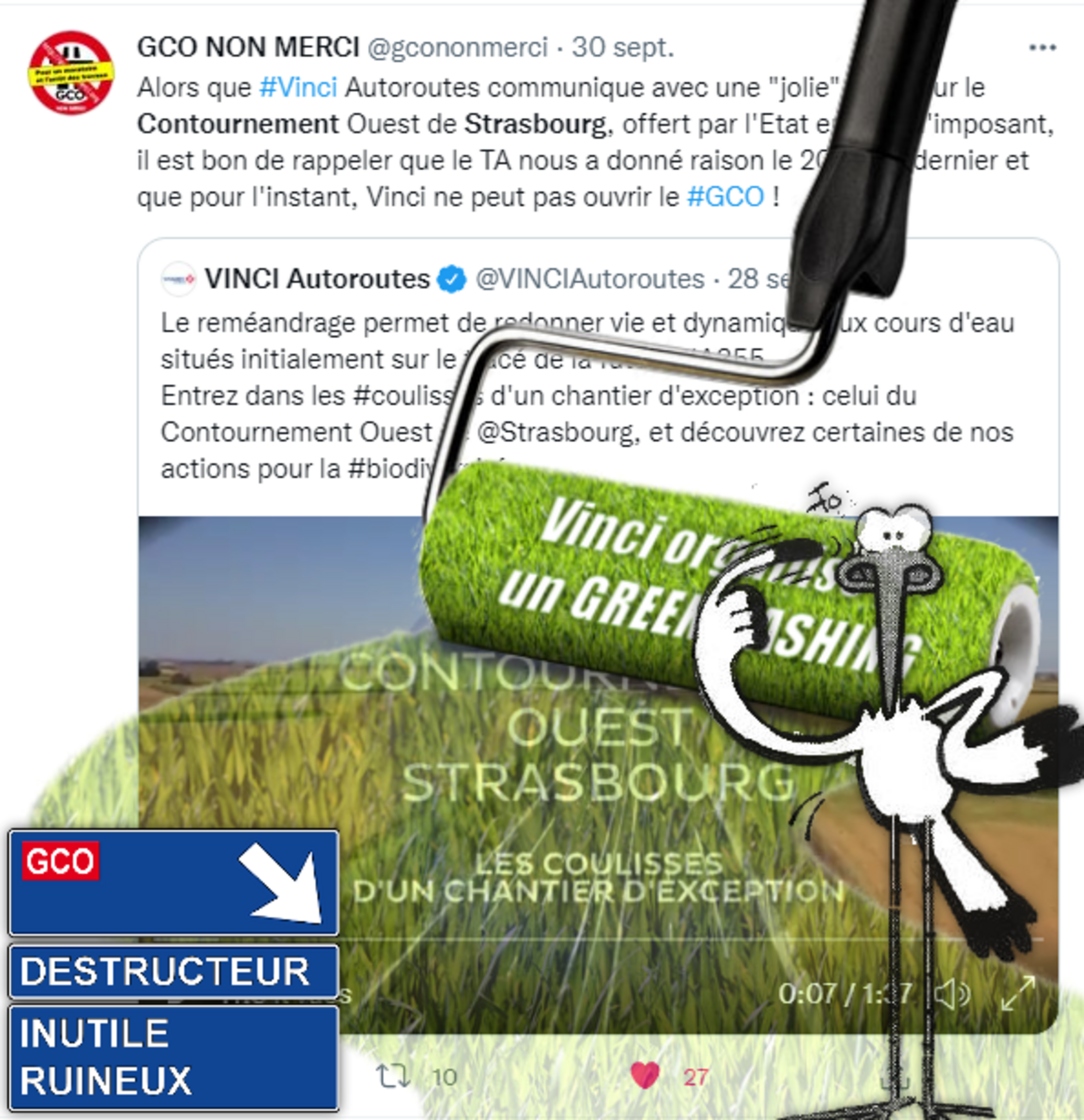 ARCOS, concessionnaire du GCO, –la très controversée et écocide autoroute A355 de contournement Ouest de Strasbourg– filiale de Vinci, organise durant le week-end des 13 et 14 novembre 2021, des journées portes ouvertes pour présenter au public son autoroute en mettant en avant les trois années de travaux « d'exceptions » (selon ses mots), ainsi que toutes les mesures entreprises en matière d'environnement : autant sur l'autoroute que pour les mesures compensatoires.