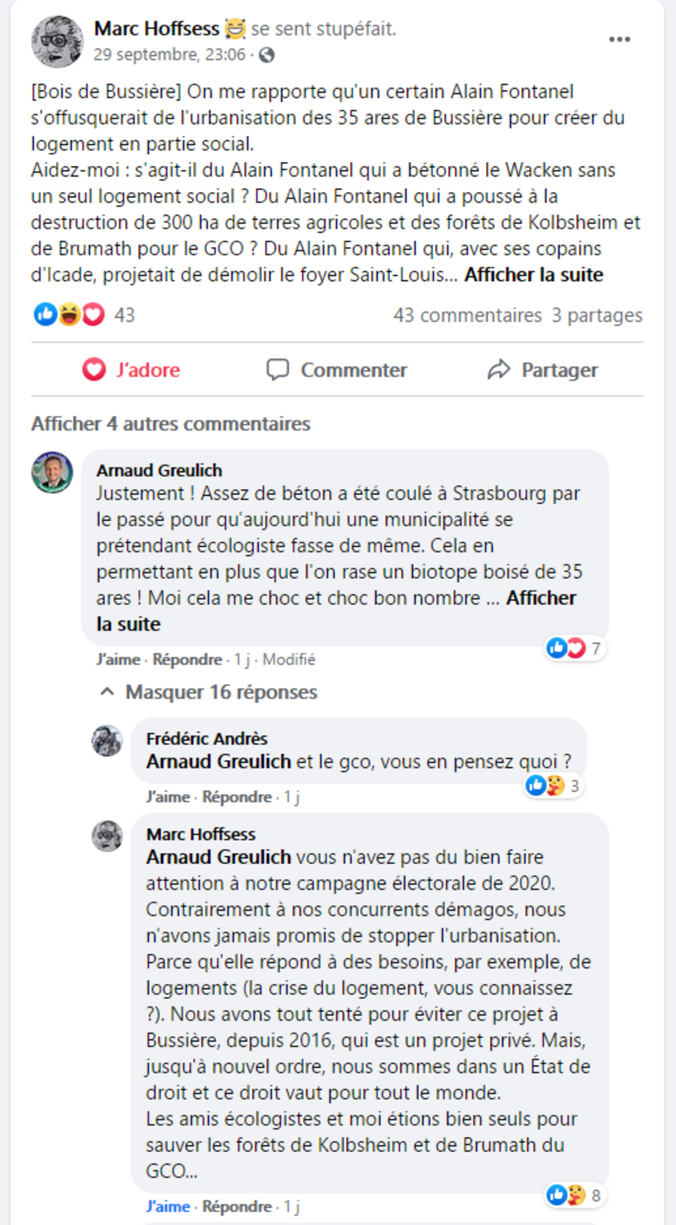 Il réagit également à un propos accusateur mettant en doute la loyauté des écologistes strasbourgeois d'être de "vrais" écolos, face à une personne se disant « choqué » comme « bon nombre de Strasbourgeoises et strasbourgeois ». Marc Hoffsess oppose à la personne qu’elle n'a « pas du bien faire attention à la campagne électorale de 2020 ». Contrairement aux concurrents démagos, la liste autour de Jeanne Barseghian « n'a jamais promis de stopper l'urbanisation. Parce qu'elle répond à des besoins, par exemple, de logements (la crise du logement, vous connaissez ?) ».