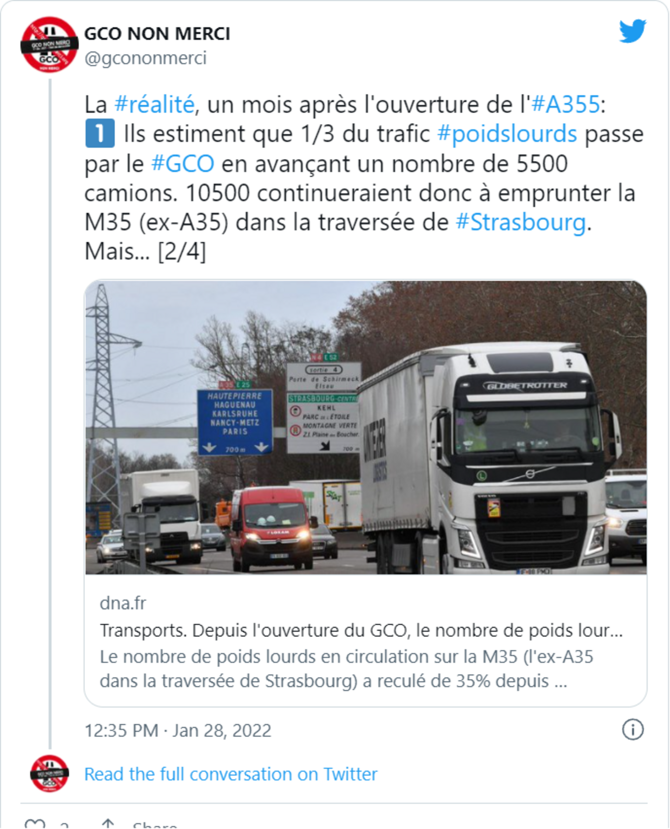 - Ils estiment qu'un tier du trafic poids lourds passe par le contournement en avançant un nombre de 5 500 camions. 10 500 continueraient donc à emprunter la M35 (ex-A35) dans la traversée de l'agglomération strasbourgeoise. Or, vu que Vinci ne souhaite pas communiquer pour le moment, le nombre de véhicules passant par le péage d'Ittenheim, les données que l'on nous donne sont théoriques.