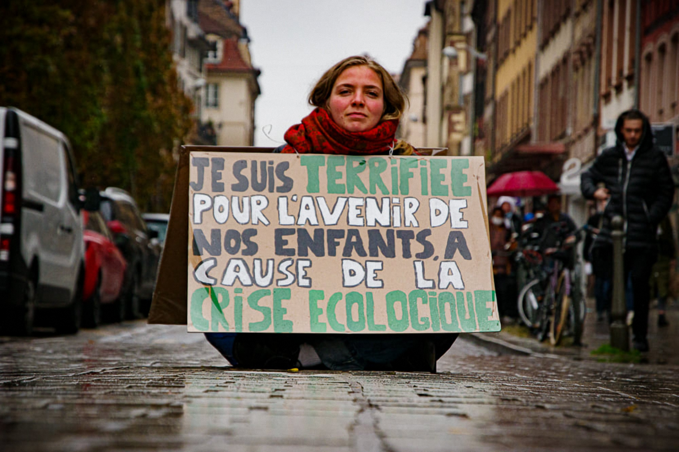 En France, ce samedi 30 octobre, environ 200 personnes sont assises, seules et déterminées, comme ici à Strasbourg, en bloquant des routes dans plusieurs villes, dans le cadre de la campagne Rebellion of One. Elles portent toutes une pancarte avec un message personnel qui exprime leur détresse et leur peur pour l’avenir si aucune mesure sérieuse n’est prise pour répondre à la catastrophe écologique en cours.