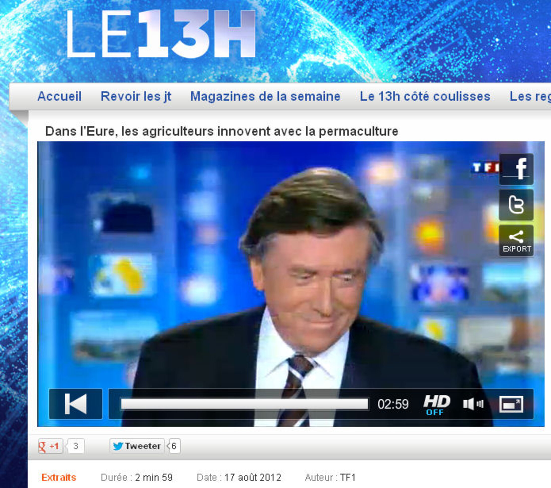 C'est comme je vous le dis ! quelqu'un l'a mis en lien sur facebook, passeque fô pas rêver, je ne regarde jamais TF1 (très peu la télé, alors tf1, vous imaginez....) un reportage de trois minutes (enfin 2,59 mn....soyons exacts....) sur la PERMACULTURE ! et pour en dire du bien !!!!