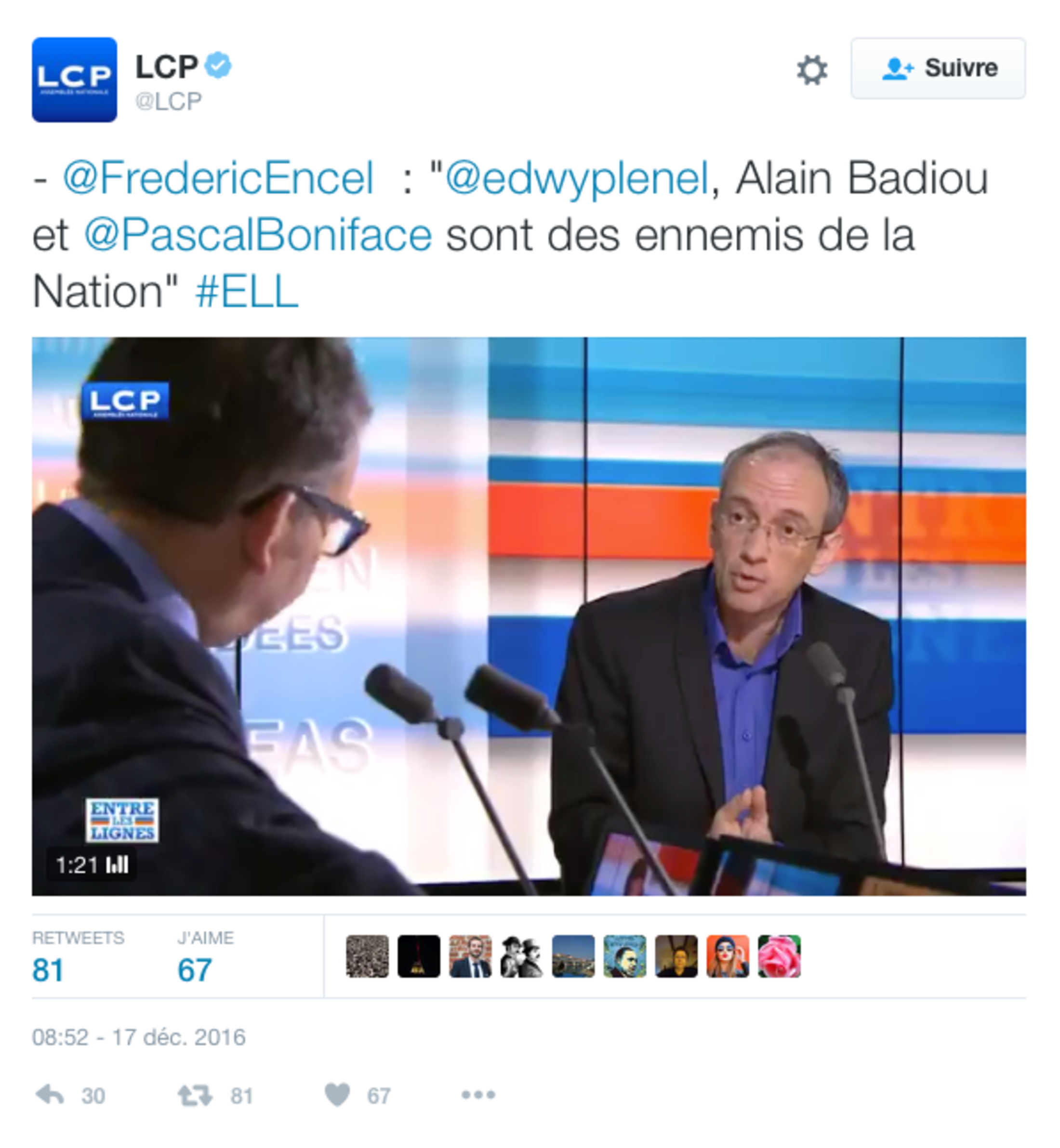 Comme le prouve la capture d’écran ci-dessous, le tweet à l’enseigne de LCP nous désignant en « ennemis de la nation » a bel et bien été diffusé à 8 h 52 (c'est indiqué tout en bas à gauche) le samedi 17 décembre 2016, soit trois heures avant la diffusion de l’émission concernée, animée par Frédéric Haziza.