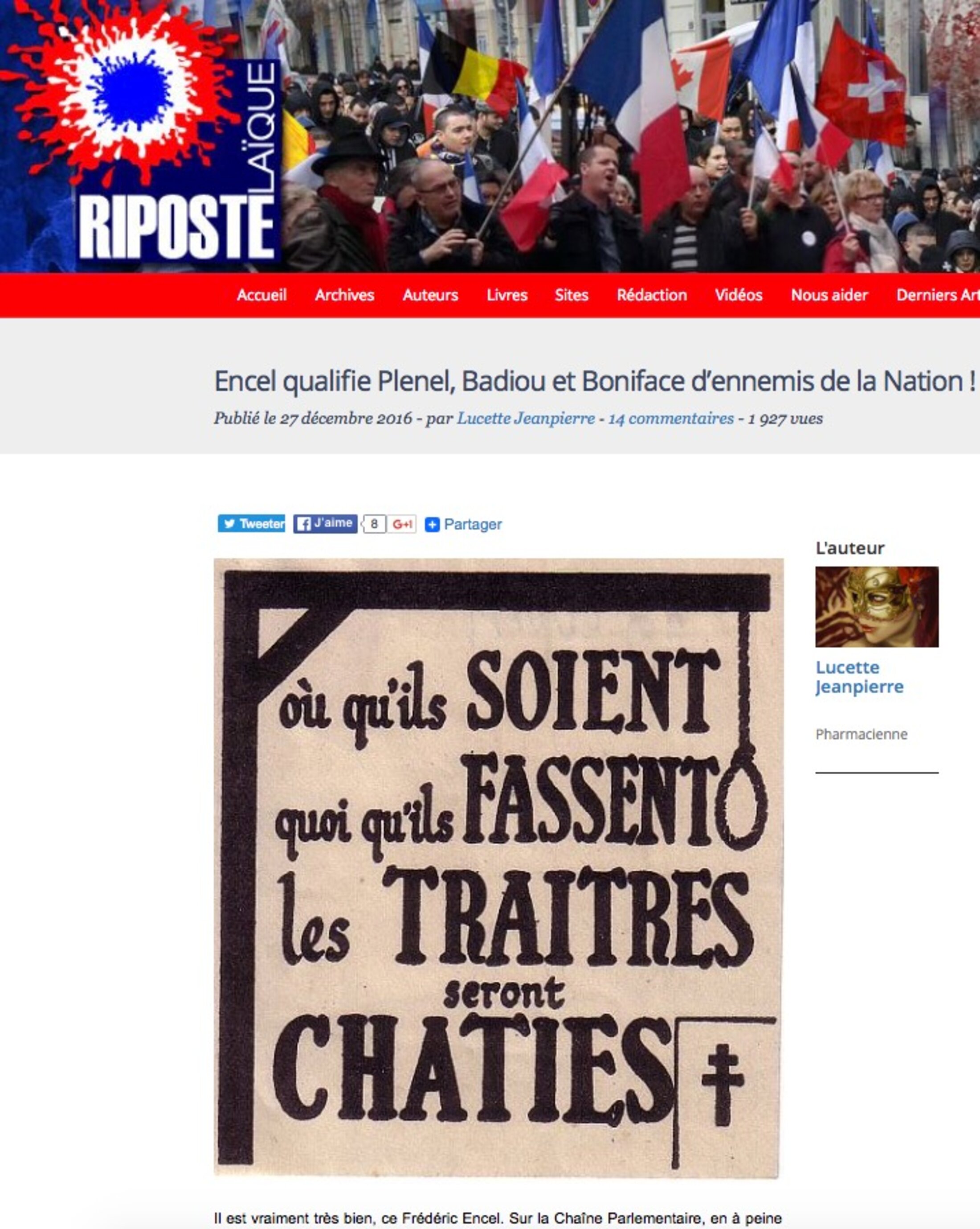 Propres aux forces les plus obscures de notre histoire républicaine, ces procédés ne sont évidemment pas dignes de l’Assemblée nationale ni de la profession de journaliste. L’extrême droite ne s’y est pas trompée, qui a repris largement la vidéo de LCP et les propos de Frédéric Encel pour appeler, sans formalités excessives, au lynchage des trois personnes concernées, comme le montre cette potence choisie en illustration par le site Riposte Laïque :
