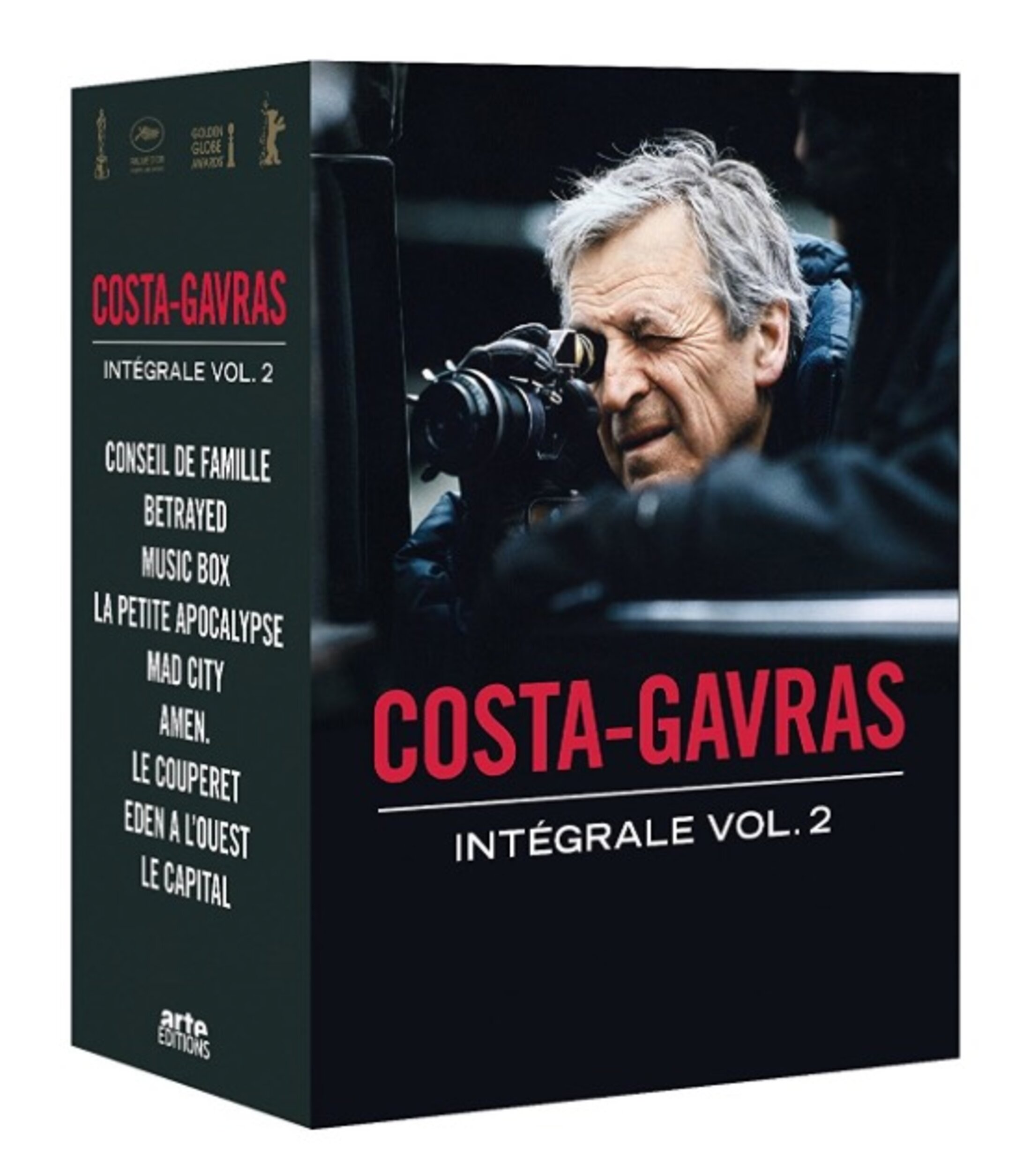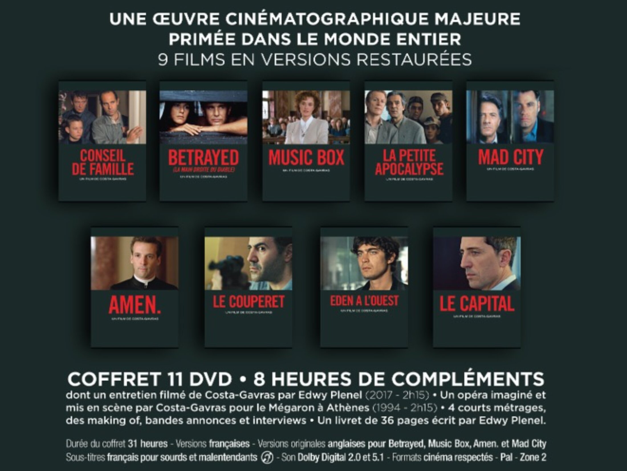 Parmi les bonus des coffrets, il y a une longue conversation, filmée en deux épisodes, que j’ai eue avec le cinéaste. Intitulée « Le Raconteur », elle présente les films, leur histoire et leur contexte, tout en visitant l’atelier de création de Costa-Gavras, sa façon de faire, de dire et de montrer. S’y ajoutent deux livrets que j’ai rédigés. Celui qui accompagne les neuf premiers films de Costa-Gavras, de Compartiment tueurs à Hanna K, en passant par Z, L’Aveu et Missing, s’intitulait « Costa-Gavras ou l’espoir » (lire un extrait dans ce billet de 2016). Pour ce deuxième volume de l’intégrale, de Conseil de famille à Le Capital, en passant par Music Box, Mad City, Amen ou encore Le Couperet et Eden à l’ouest, je l’ai intitulé « Costa-Gavras ou la résistance ».