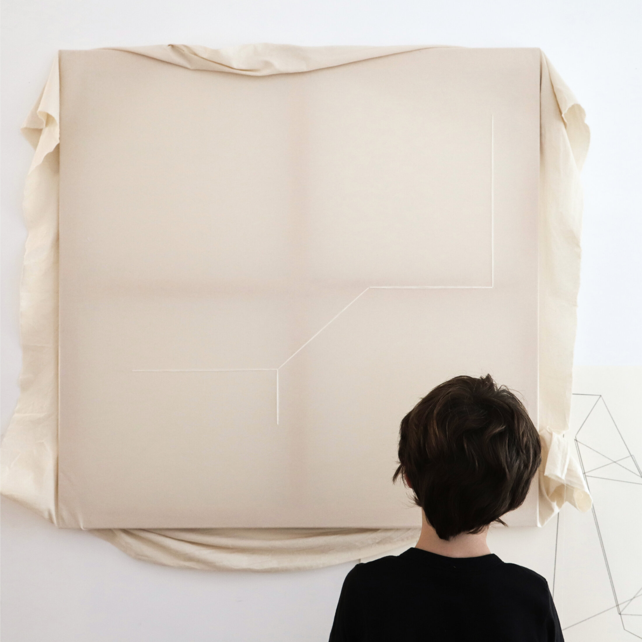 Pour contenir le caractère mouvant et plissé de l'étoffe, le drapé a été soumis à deux tensions l'une verticale, l'autre horizontale. Or, deux tensions ne s'additionnent pas comme deux dimensions, mais engendrent une résultante. Ainsi, la surface est ressentie comme polarisée et suggère, par exemple, une contraction à l'endroit du croisement des traverses du châssis (→0D). Un point quelconque, qu'on imaginera se déplacer dans le plan, sera soumis à des tropismes de translations rectilignes (→1D), et possèdera donc un degré de liberté légèrement amoindri. C'est comme si, en passant du volume à l'aire, on était allé juste un peu trop loin, et ainsi je dirais qu'on a affaire à un espace à 1,75 dimensions.