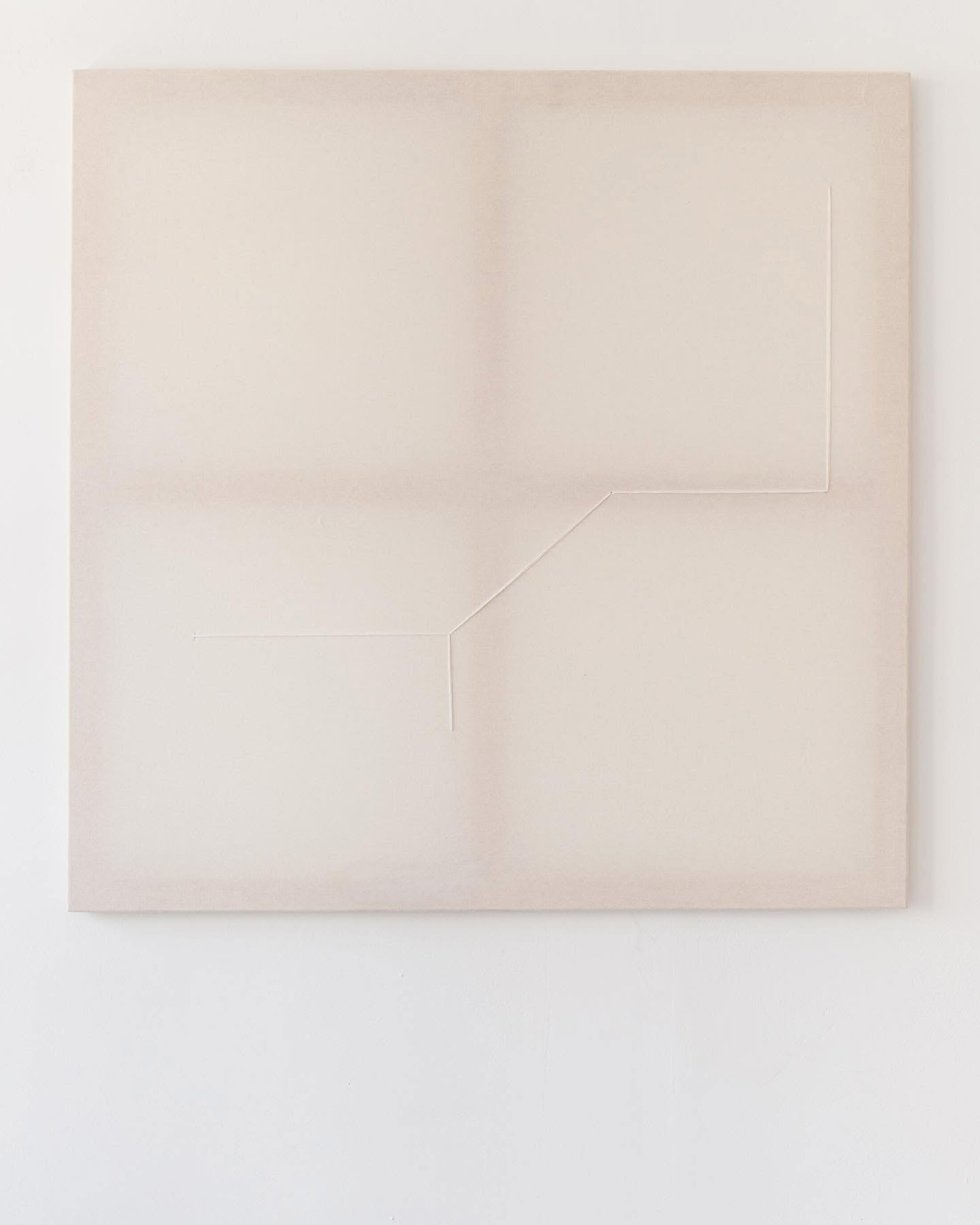 Telle qu'on la découvre, l'œuvre se compose d'une toile semi-opaque de coton brut, tendue sur un châssis d'un mètre par un mètre. Sur le plan obtenu, ton sur ton, se dessine une articulation de cinq segments, chacun mis en relief par un lancé de plusieurs fils de coton.
