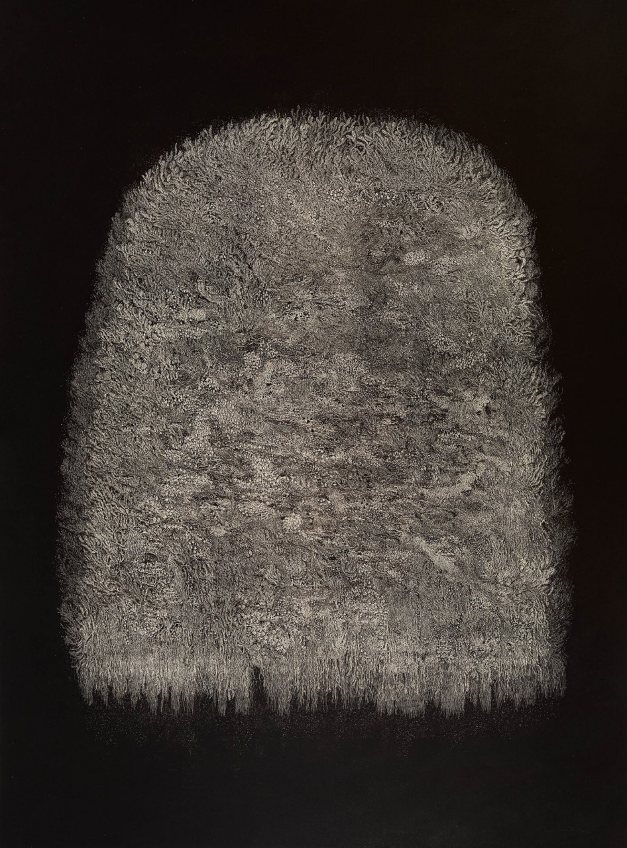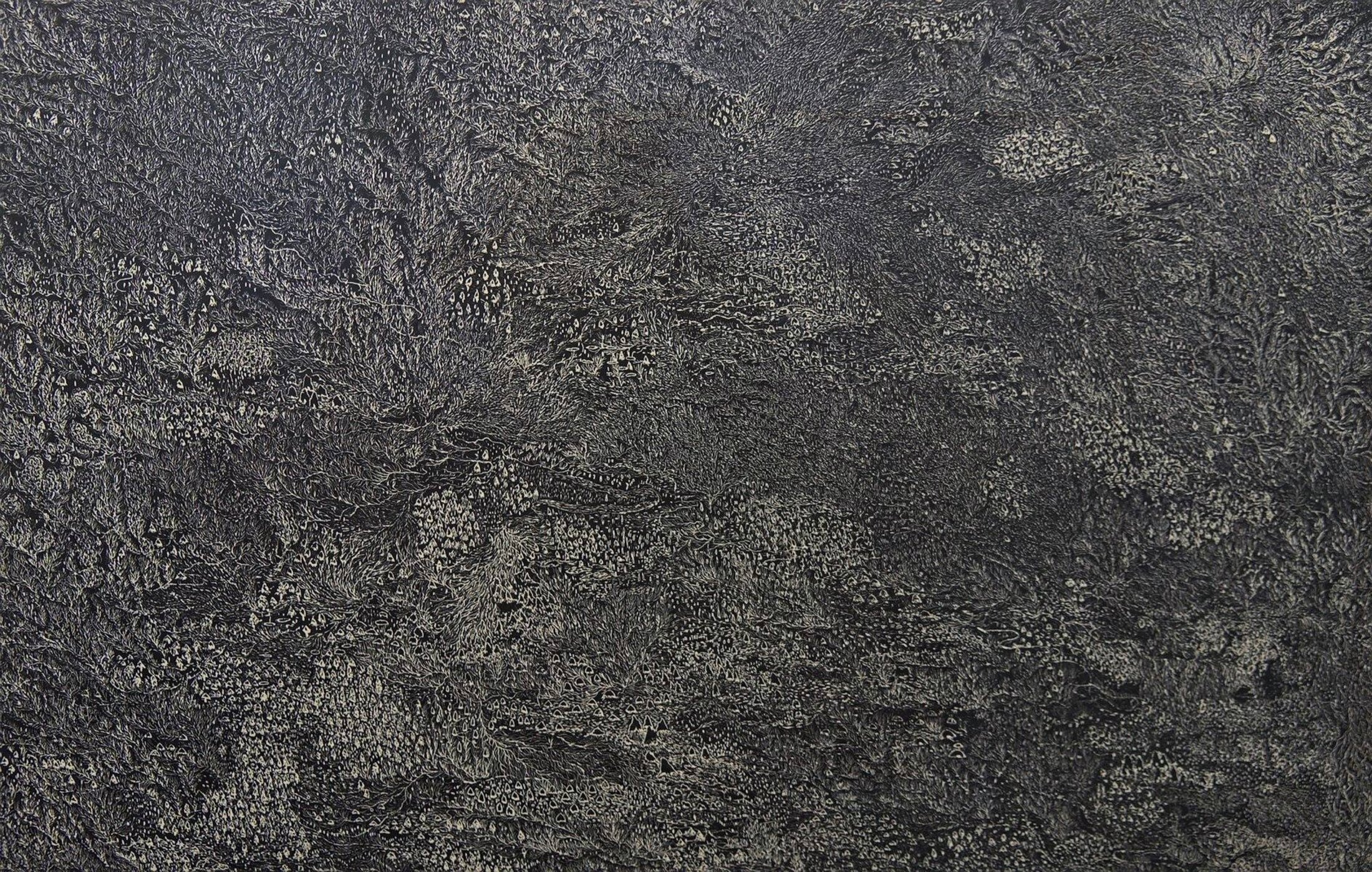 Ces monticules, que les impressions soient réalisées en creux ou en relief dans les œuvres apparentées, on les rencontre toujours de deux sortes ; ils sont noirs ou blancs. Dans Cape, ils récapitulent pour eux seuls à chaque fois la forme de la représentation comme autant de monades disséminées. Dans l’histoire de Cape, je dis que ce sont des fours installés là pour exploiter le territoire ; meules pour le charbon de bois, bas fourneaux pour le minerai de fer, fumées noires et fumées blanches diffusant de proche en proche puis dans les lointains les volutes des leurres que nous avons précédemment parcourus.