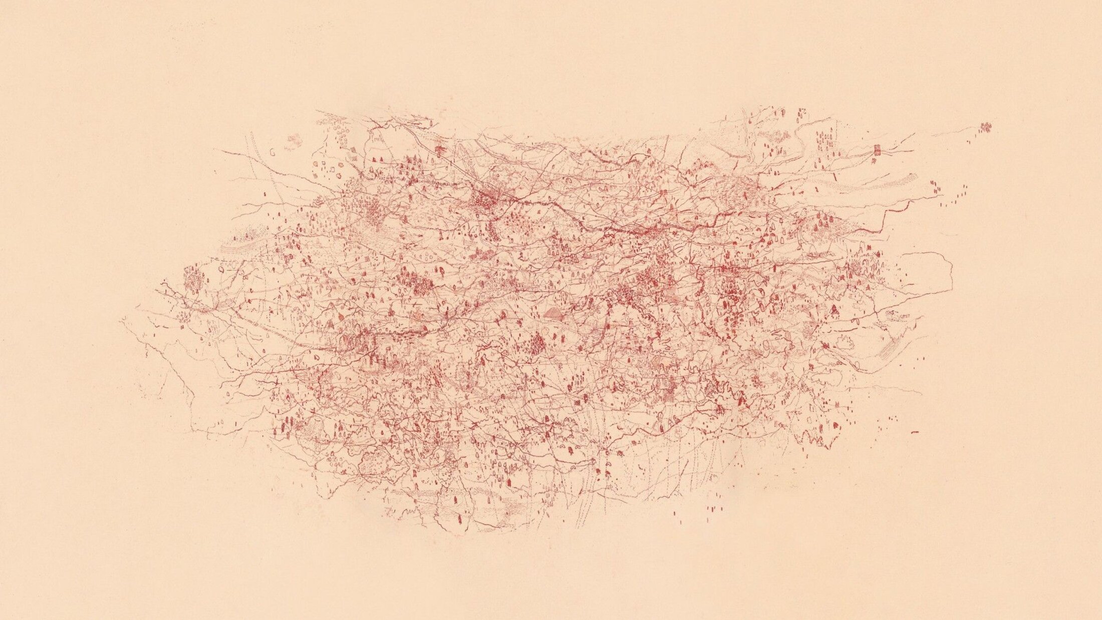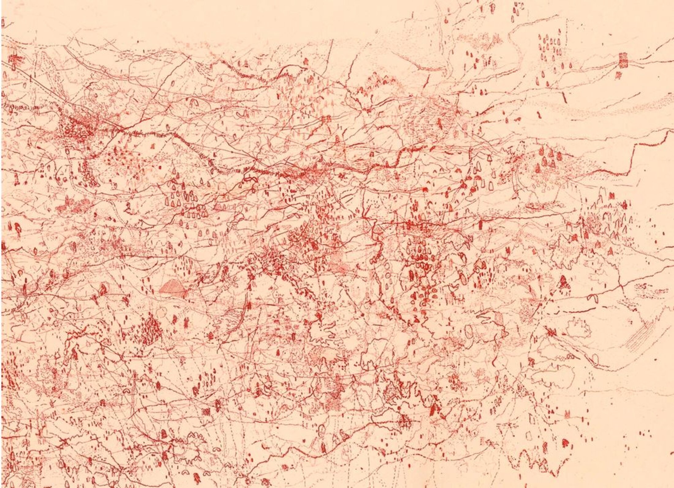 Sur ce plan immanent, dans la terre striée, différents aspects doivent tour à tour être prélevés puis soulevés selon les intervalles qui permettront leur expression. On cherchera donc, au cœur des nervures, dans ce qui s’apparente à un système lymphatique, des centres de collecte puis des vecteurs d’échappée. Or, une observation attentive met en relief des protubérances verticales, sortes de Phallus impudicus, qui parsèment le tapis de brindilles. Ce motif attire particulièrement l’attention, d’autant qu’on le trouve déjà dans une œuvre de 2009, Les Échapées d'Âme 2, palimpseste d’écritures horizontales où ces picots, en points de capiton, semblent bloquer les translations au profit de l’épaisseur bouffante d’un chevauchement d’images.
