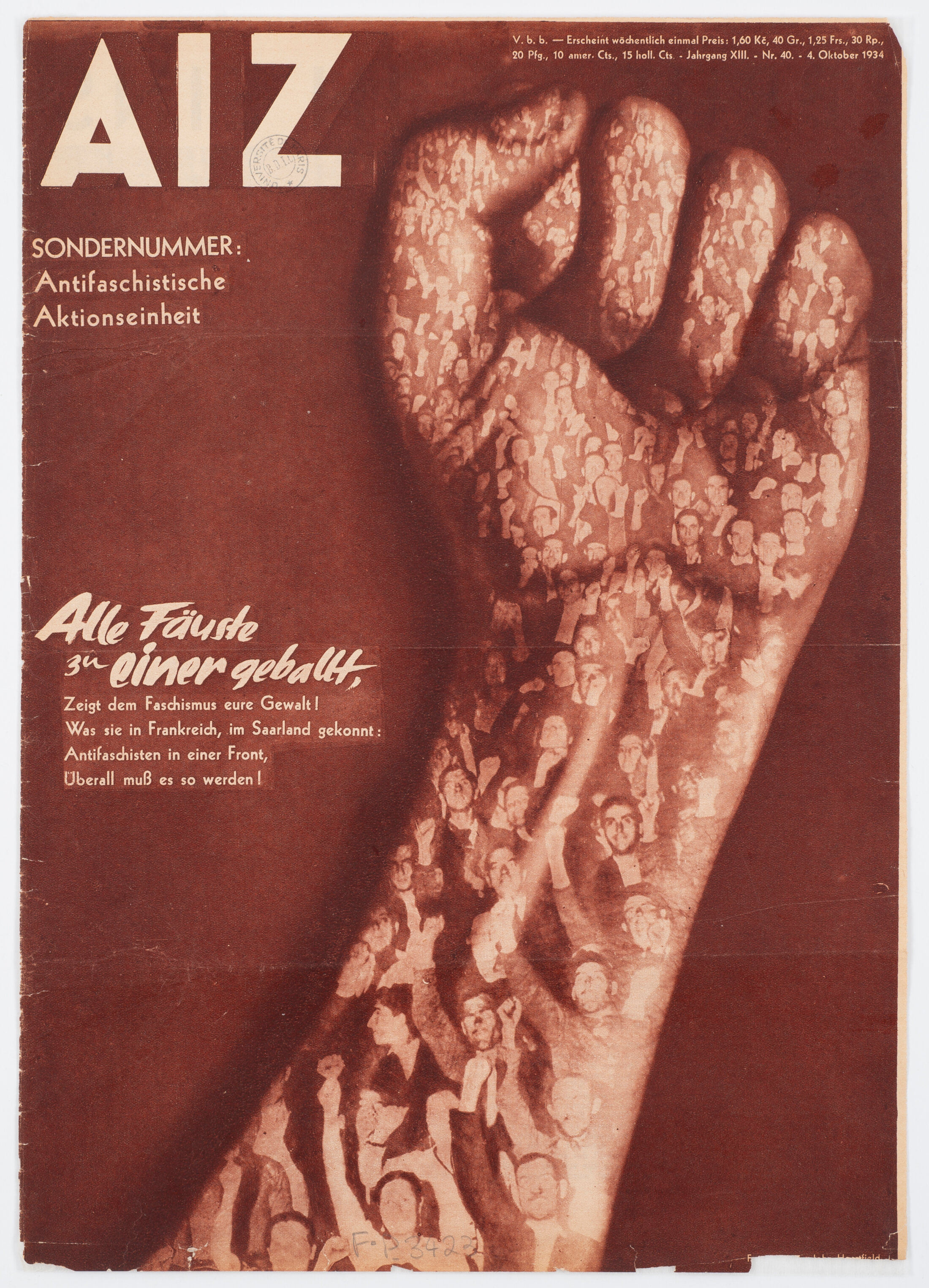 En 1928, il signe l’une de ses œuvres les plus percutantes, Cinq doigts à la main. Le chiffre de la liste communiste se transforme en main ouvrière prête à saisir l’avenir. Le photomontage devient alors un outil de mobilisation directe. Grâce à sa collaboration avec l’Arbeiter-Illustrierte-Zeitung (AIZ), ses images circulent à des centaines de milliers d’exemplaires et affrontent frontalement la propagande nazie.