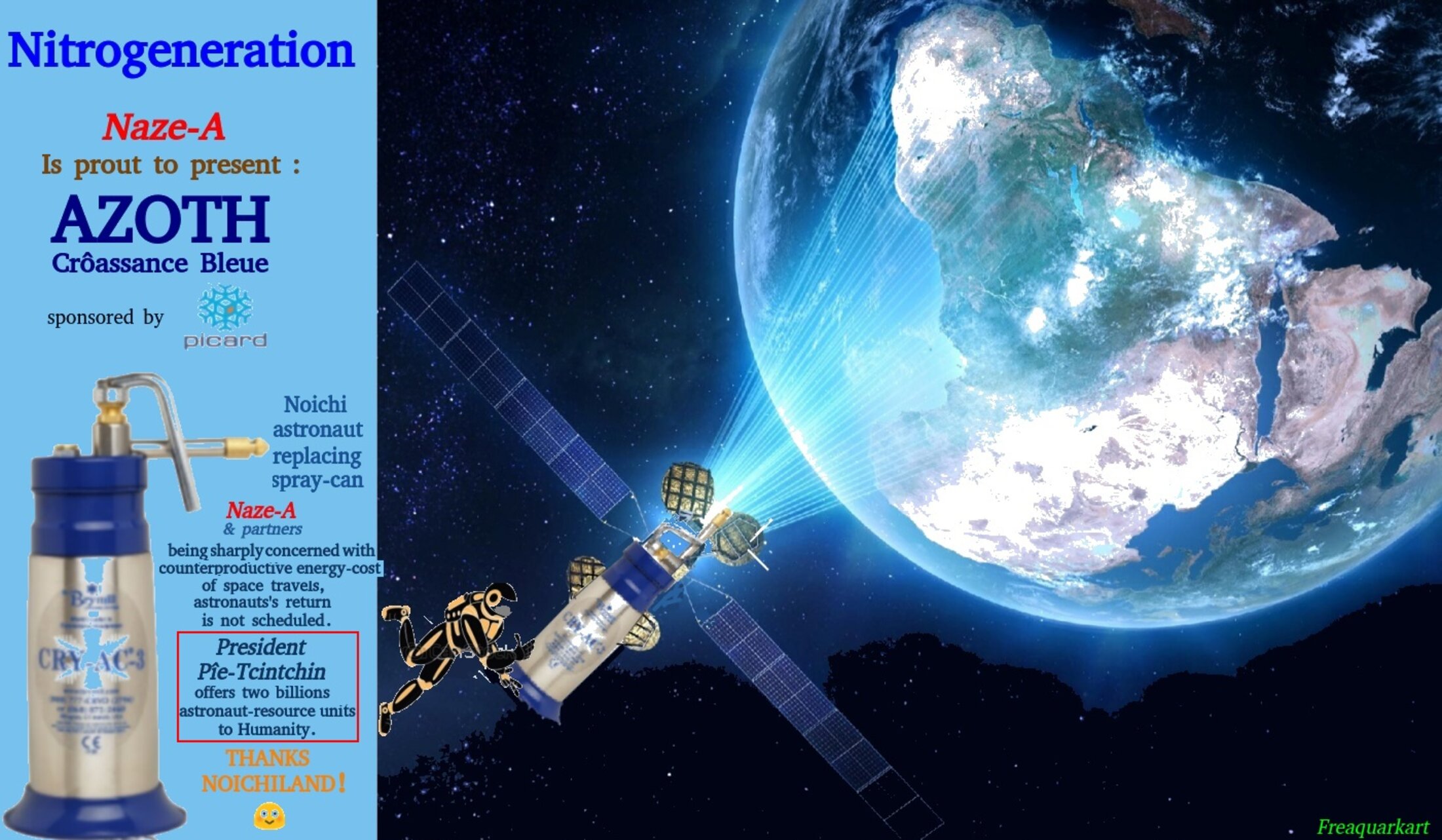 "Astraunaute Noichi remplaçant un récipent-spray. Naze-A et ses partenaires sont si préoccupés de la contre-productivité du coût en énergie du voyage spatial que le retour des astronautes n'est pas prévu. Le Président Pîe-Tcintchin offre deux milliards d'unités de ressource humaine astronautique à l'Humanité. Merci Noichi-land."