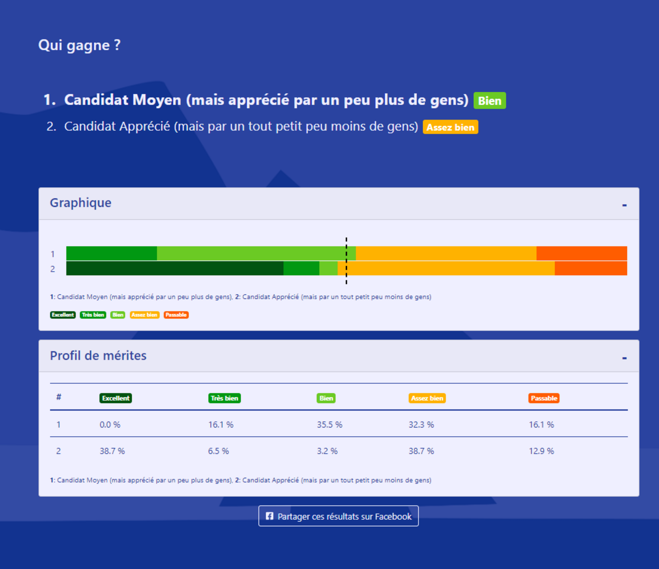 Dans cette simulation, le candidat obtenant le plus de mentions au moins “Assez Bien”, “Bien”, et "Excellent", mais aussi le moins de mentions négatives, perd car il a un cumul moins bon des mentions meilleures que la médiane.