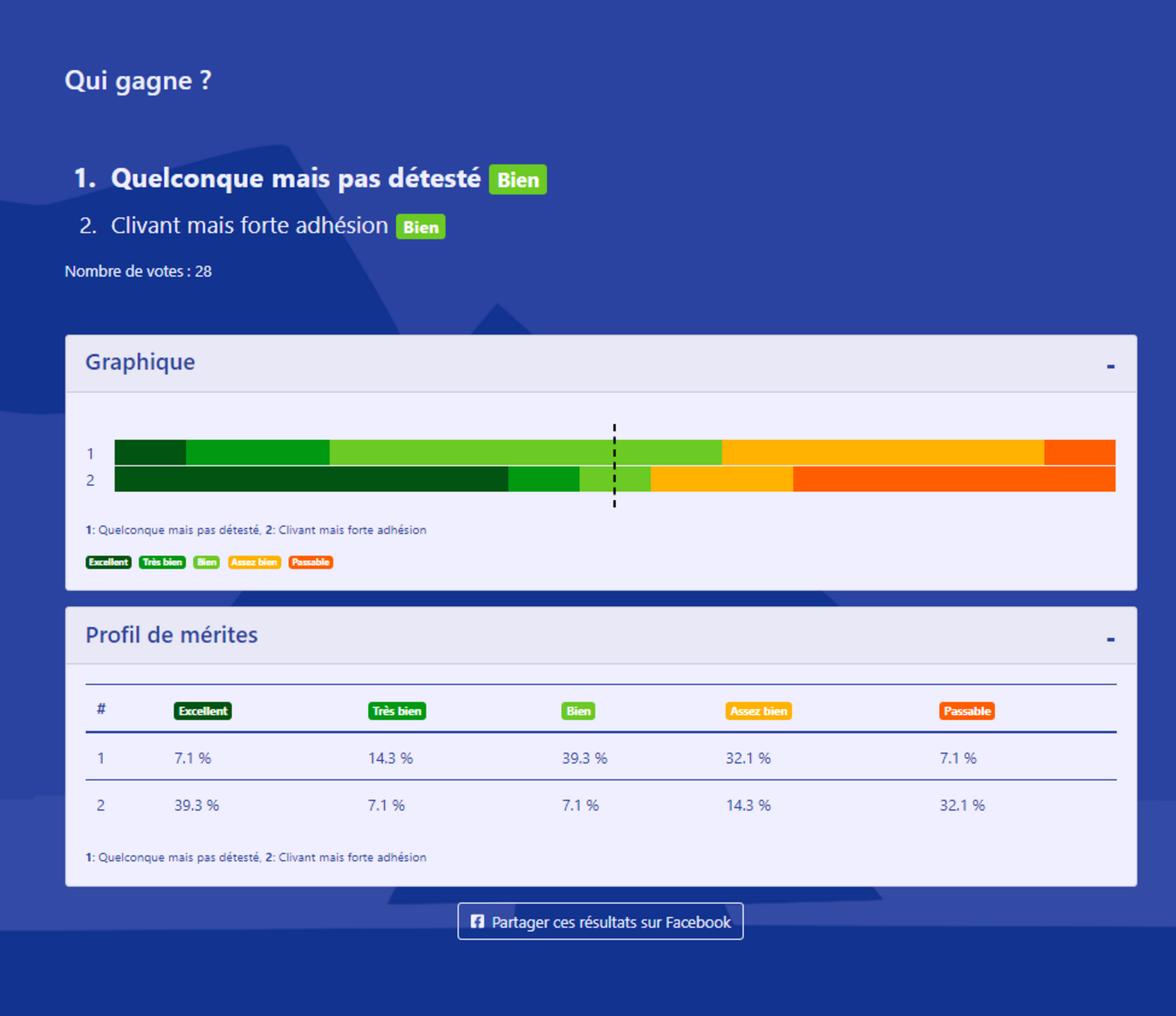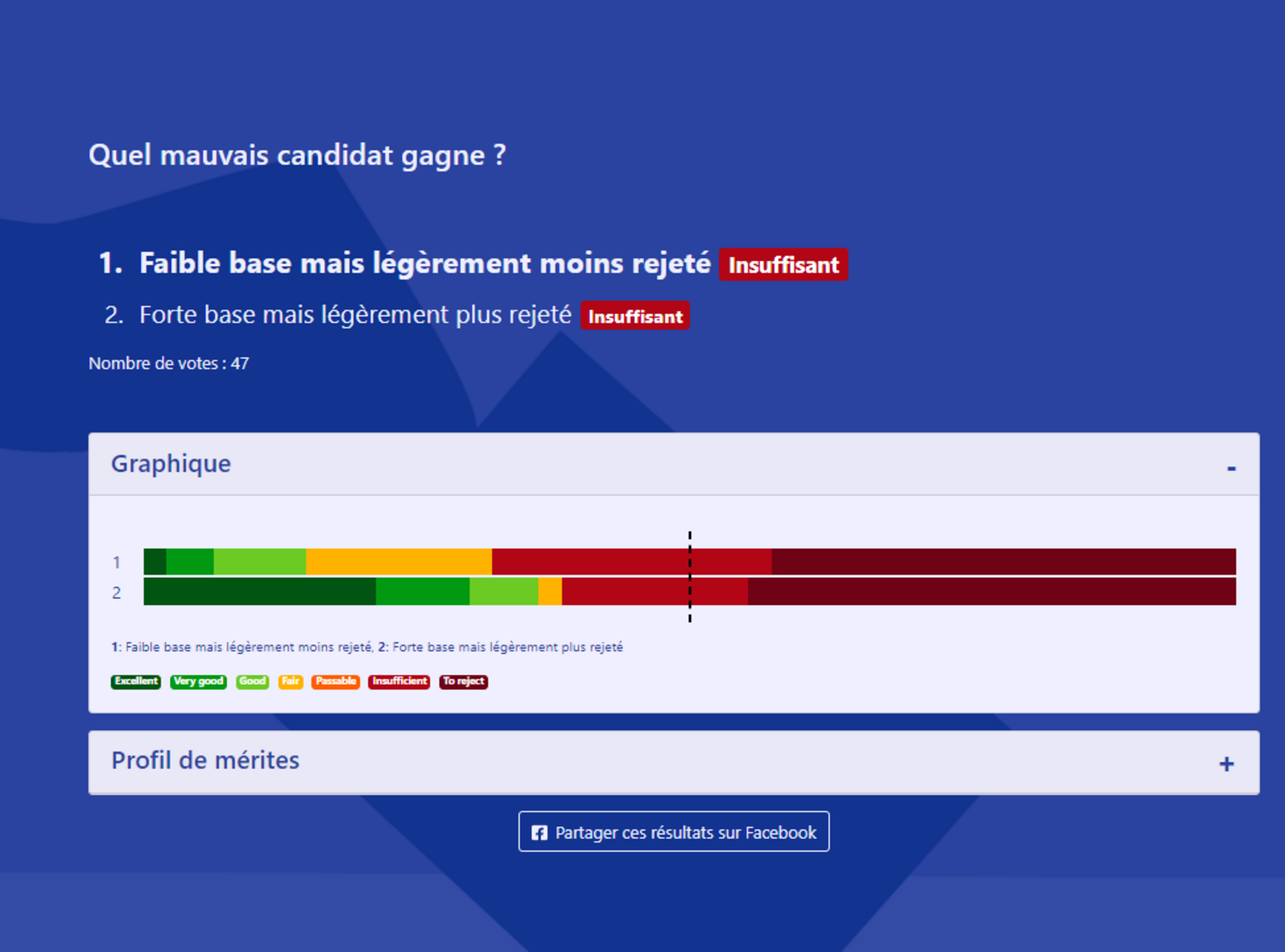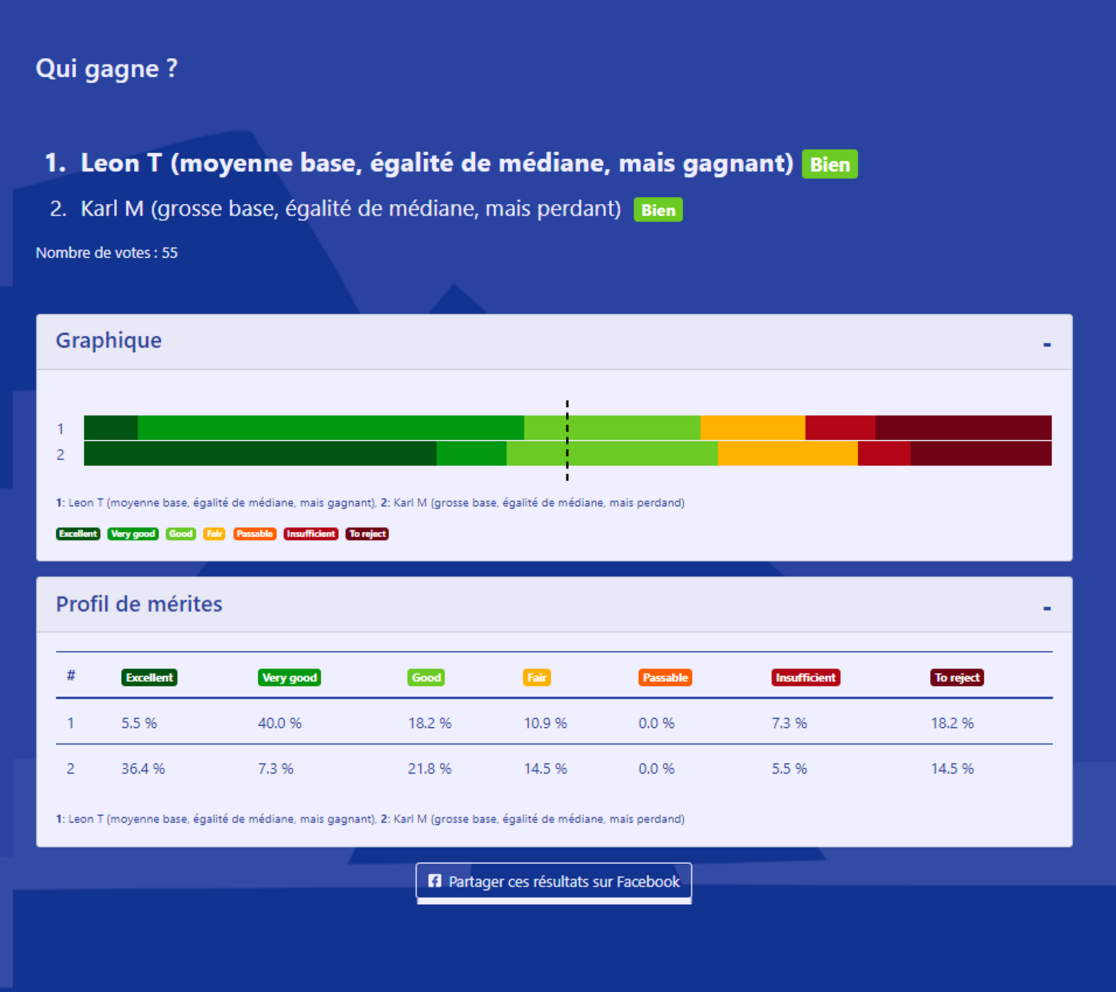 1.Dans cette simulation, même si les deux candidats sont très rejetés, ce n'est pas la personne qui a le plus d'avis positifs qui l'emporte, mais celle qui a le moins grand pourcentage de la pire mention. La proportion et la nuance des avis positifs n'entrent plus du tout en compte.