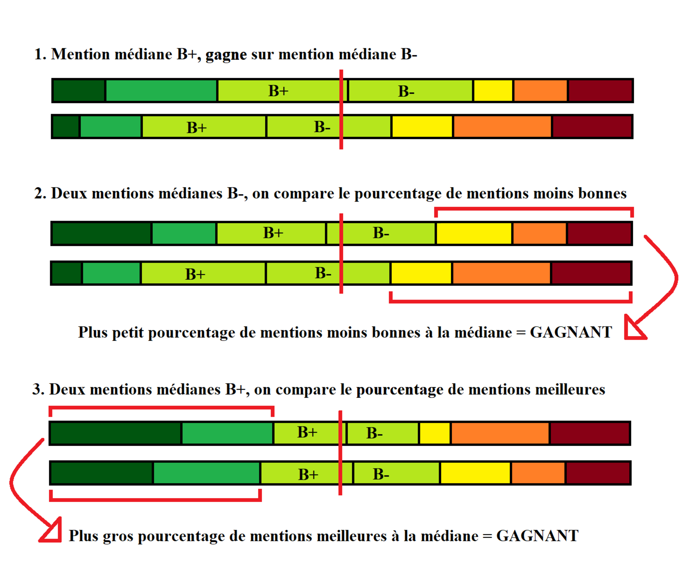 Le second problème -qui en découle- est que dans les cas d'égalité de mention majoritaire, le déterminant est soit le cumul des mentions meilleures que la médiane, soit le cumul des mentions moins bonnes que la médiane.