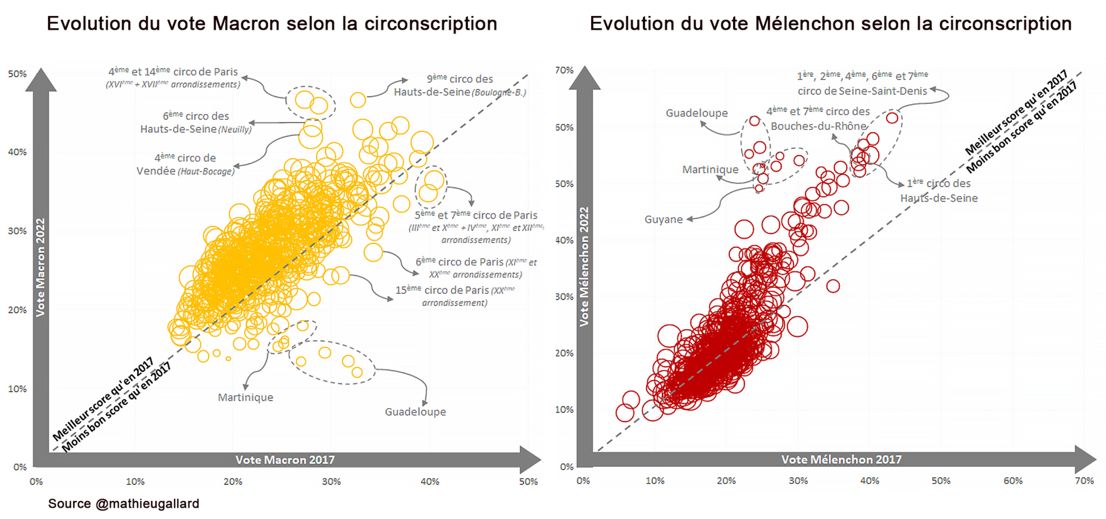 Ces graphiques montrent assez bien que Mélenchon prend ce que Macron a perdu dans les Outre-mers, mais c'est aussi beaucoup le cas pour Paris et la petite couronne, ce qui correspond aux circonscriptions "plutôt de gauche" que la majorité présidentielle avait réussi à voler en 2017.
