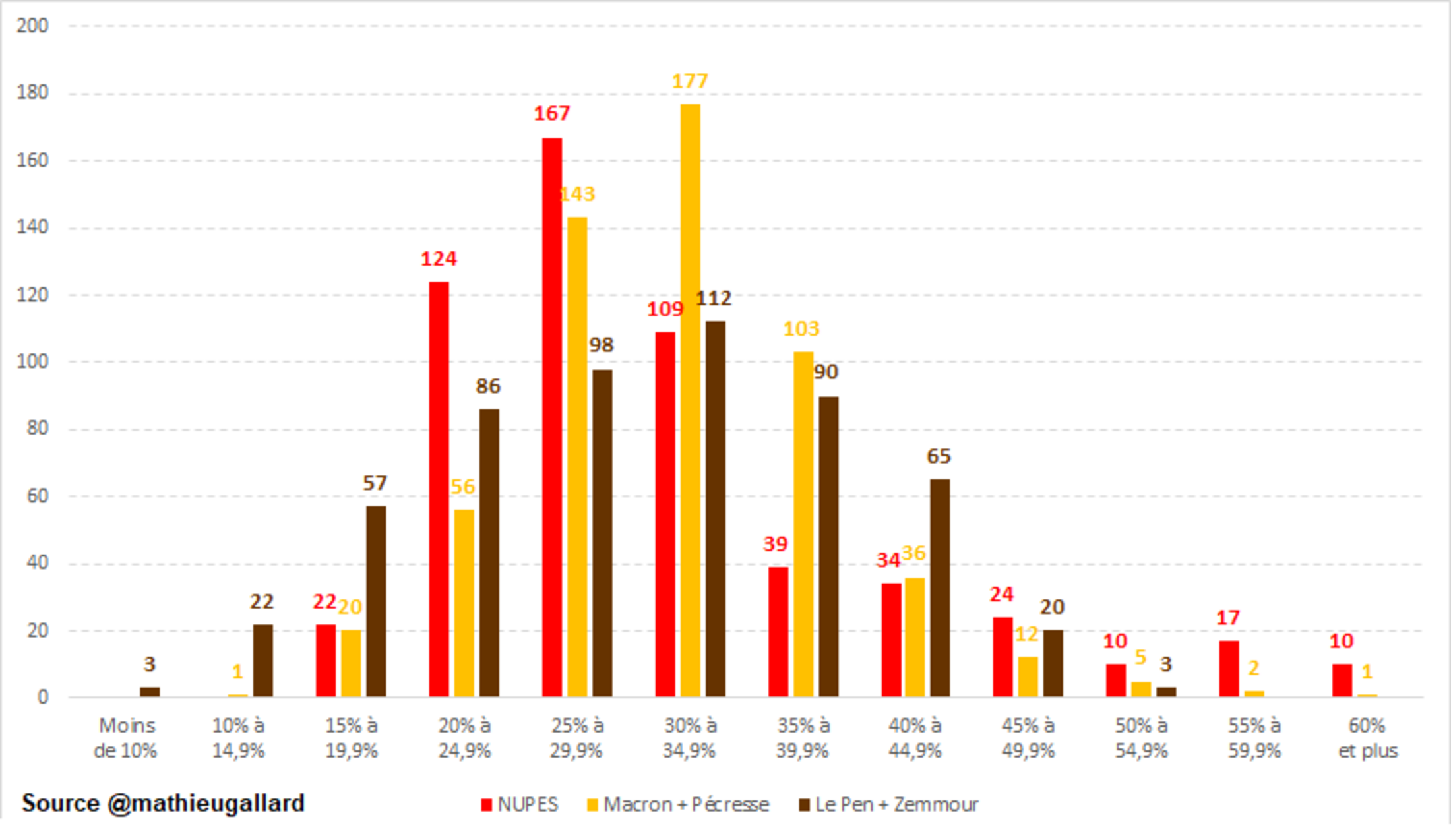 A partir de là, il va se passer une chose très simple : La NUPES va se retrouver au 2nd tour dans environ 450 à 500 circonscriptions sur 577, dont la majorité de ces duels seront face aux Macronistes. Les réserves électorales étant similaires entre les deux camps, seule comptera alors la mobilisation ou sur-mobilisation de ces électorats respectifs, et la qualité des reports de voix.