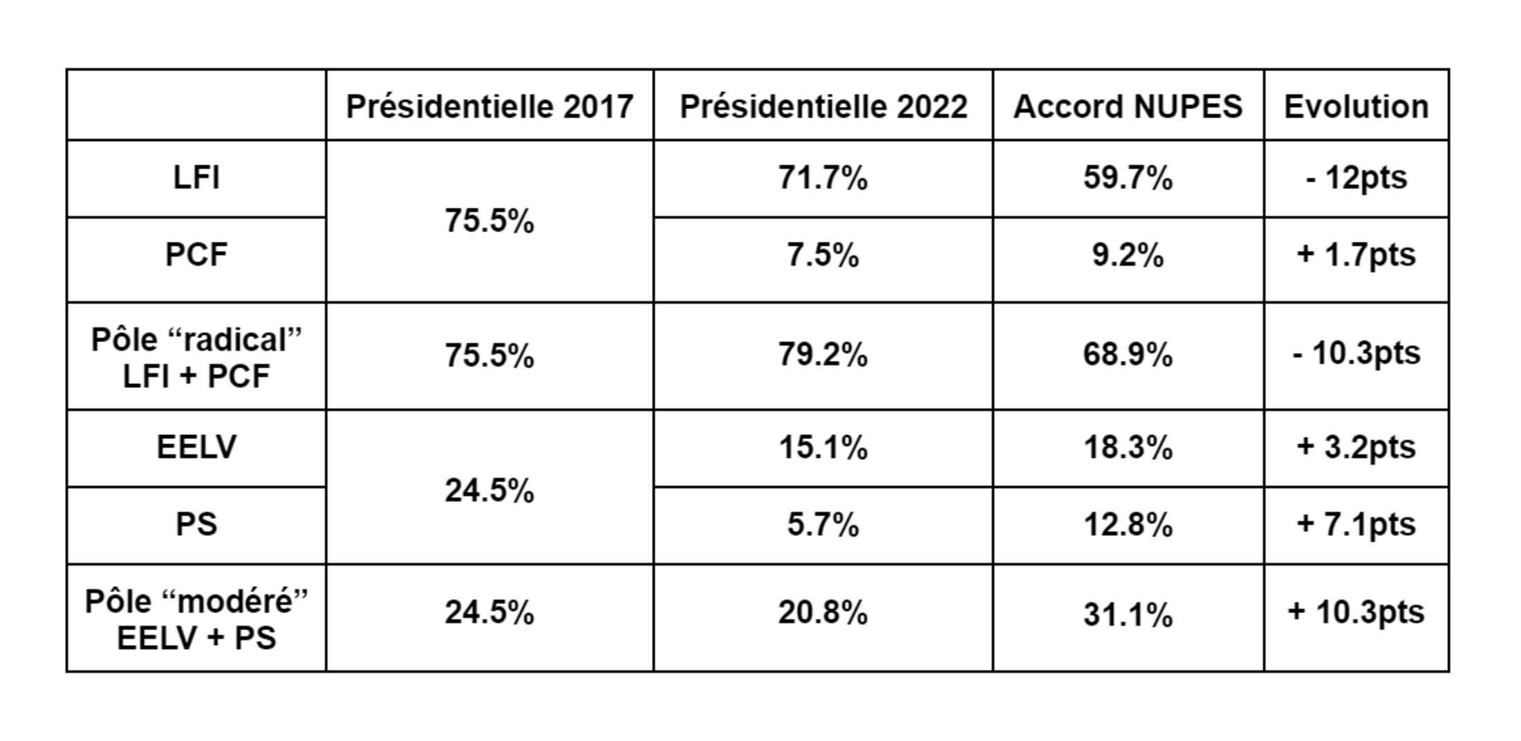 Cet accord a finalement été assez simplement construit : les membres de la NUPES se sont appuyés sur une reconduction quasi systématique des députés sortants***, suivie d’une répartition "À la proportionnelle des résultats du 1er tour de la présidentielle”. Stratégie qui paraît cohérente en respectant le rapport de force des deux dernières présidentielles entre le pôle radical et celui social-démocrate.