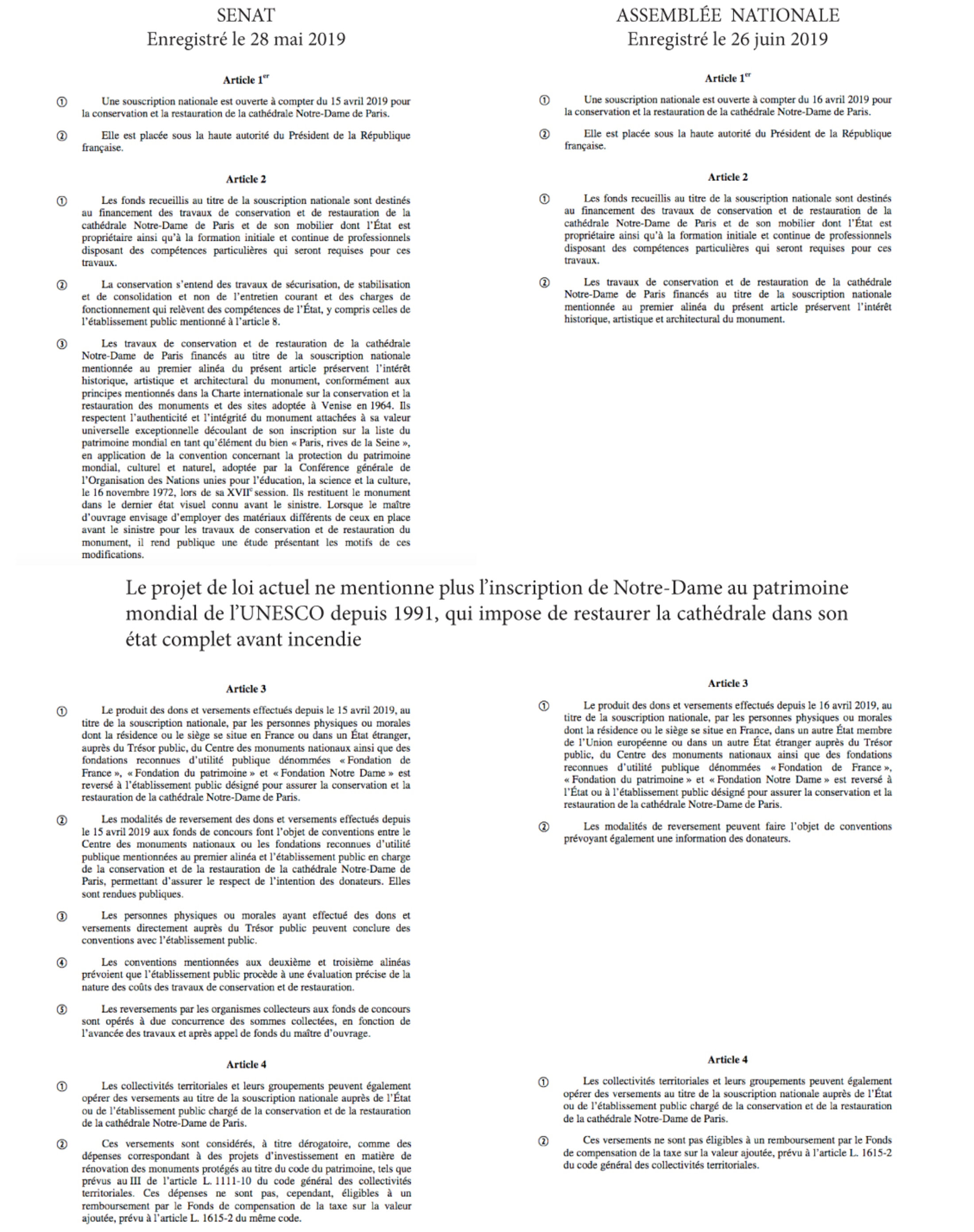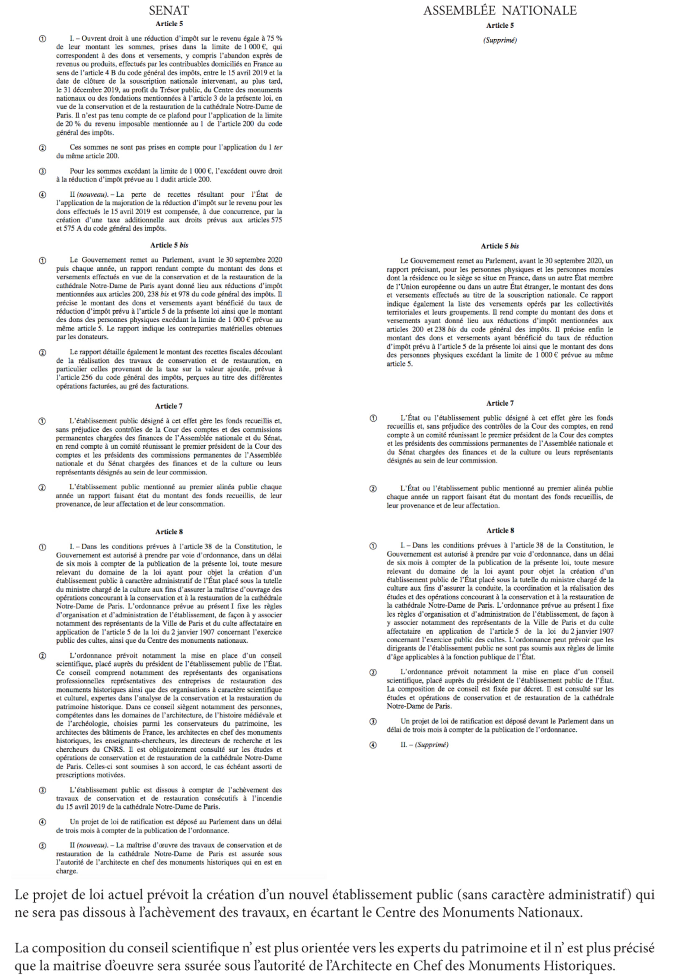 La démarche de la majorité de l'Assemblée est limpide, presque tous les ajouts du Sénat ont disparu. Voici un comparatif rapide des textes du Sénat et de l’Assemblée Nationale pour le projet de loi pour la conservation et la restauration de la cathédrale Notre-Dame de Paris et instituant une souscription nationale à cet effet.
