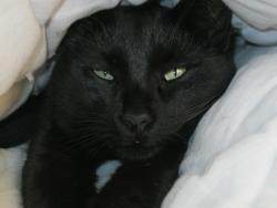 Six heures et quart. Le jour se lève à peine. Une patoune noire que j'aperçois à travers mes paupières plissées est posée sur mon bras. Les griffes très légèrement sorties caressent ma peau jusqu'à mon épaule. Un ronron doux et rythmé susurre des mots gentils à mon oreille.