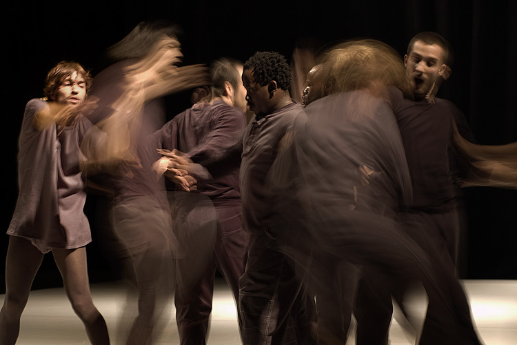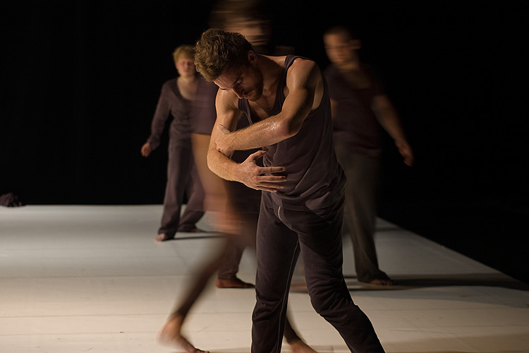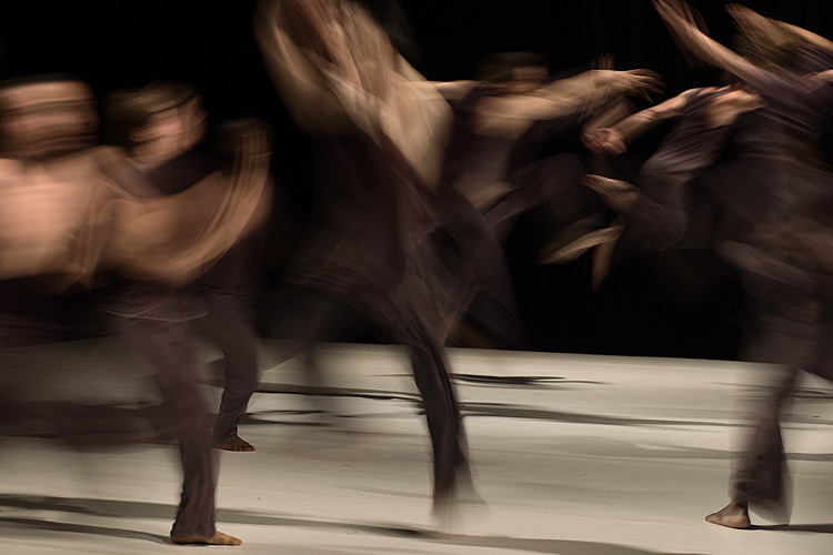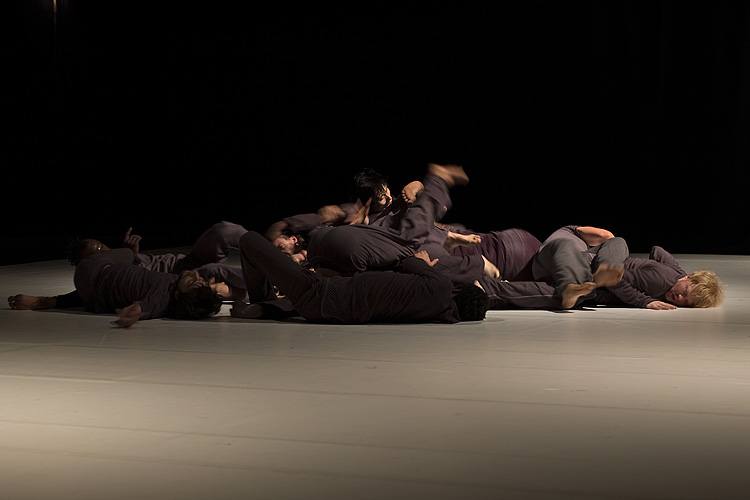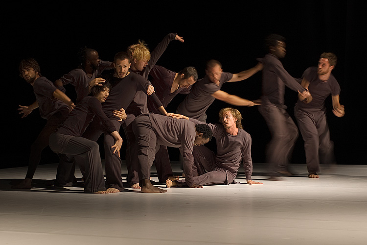 « Shock », c'est 12 danseurs, tous hommes, vêtus de gris-noir. Souvent, seulement deux d'entre eux se partagent la scène, sur laquelle ils se livrent à une sorte d'affrontement, accompagné par des opéras de Verdi, Mozart et «Love Me Tender » d'Elvis Presley. On reconnaît dans leur gestuelle, des arts martiaux tels le Kung Fu ou le Tai Chi, des mouvements d'escrime aussi, de machines de guerre ou des robots Transformers. Alors, le jeu s'estompe en une valse ou un tango. Soudain un danseur se détache de son partenaire pour décrire de grands cercles en courant sur la scène; un à un, tous finissent par le suivre. Fluide, l'ensemble s'épaissit en une masse dense qui gonfle et se dégonfle, roule vers le public. Je pense aux monstres gluants, rampants et gémissants, animés par Hayao Miyazaki. Puis c'est tempête.