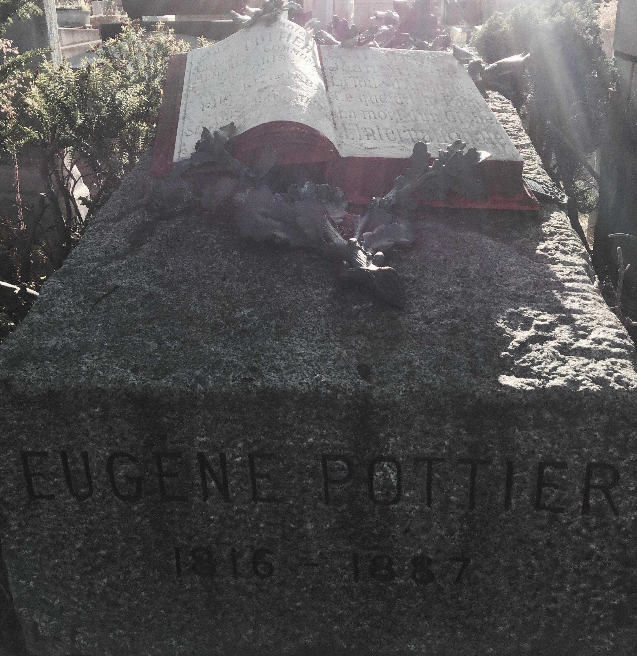 Il réussit à s’enfuir, rejoint la Belgique, puis l’Angleterre, où sa maîtresse Caroline Petit vient le rejoindre, avant de donner naissance à leur fille, Marguerite. Tous trois s’embarquent pour les Etats-Unis, où Pottier se remet à travailler. Il rejoint aussi la franc-maçonnerie, et continue de militer au sein des mouvements socialistes. Sa santé, pourtant, se dégrade. Les produits chimiques qu’il a manipulés ou inhalés en peignant les étoffes l’ont intoxiqué. Quand il revient à Paris, après l’amnistie de 1881, il est pauvre et malade, mais continue à écrire dans le Cri du peuple. Lorsqu’il meurt en 1887, à la suite d’un AVC dans une chambre misérable de la Goutte d’or, il ne sait pas que l’Internationale fera le tour du monde grâce à une musique qui n’a pas encore vu le jour. A son enterrement, près de 10 000 personnes suivent son cortège funéraire (et non, comme l’écrit l’Humanité dans un moment d’exaltation, 500 000). Mais le cortège est perturbé par les forces de police qui arrachent les drapeaux rouges des mains des manifestants. Au lieu de rendre hommage à Pottier, les journaux commentent cette agitation qui vient rappeler les jours maudits de la Commune. La fin du poète n’est pas à la hauteur de ce que l’avenir lui réserve. Il est enterré au Père-Lachaise, 95e division, pas très loin du mur des Fédérés où reposent Jean-Baptiste Clément, l'auteur du Temps des Cerises, et la famille Malberg.