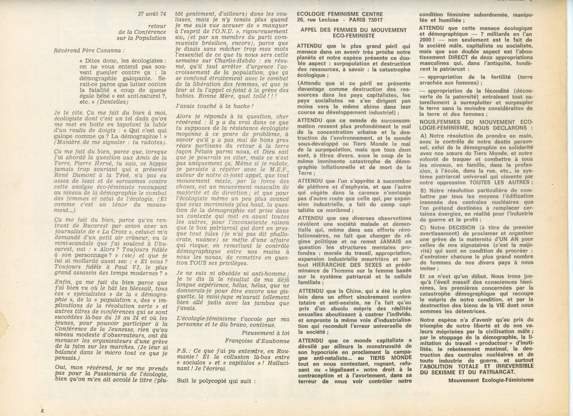 C’est ce texte, paru en septembre 1974 dans Charlie-Hebdo qui m’a fait connaître Françoise et l’écoféminisme. Alors jeune homme de 20 ans, j’avais été fasciné par la radicalité de cet appel et avais donc écrit à l’écrivaine et militante féministe et écologiste. Trente années d’une amitié sans égale ont suivi. Aujourd’hui, alors que Françoise nous a quittés voilà bientôt dix-neuf années, je ne peux que constater à quel point elle et ses amies avaient raison et à quel point l’urgence (pas seulement climatique) s’est aggravée. Sa pensée et son action, fécondes et plus que jamais nécessaires, sont toujours là pour tous les soulèvements du vivant.