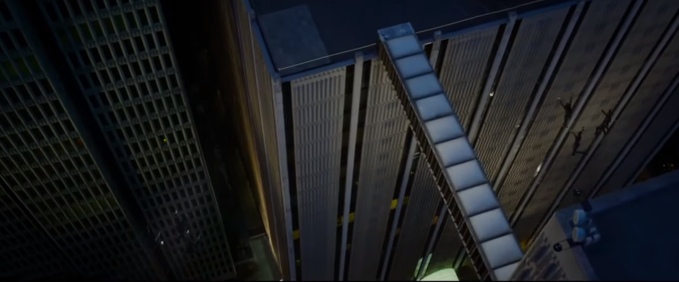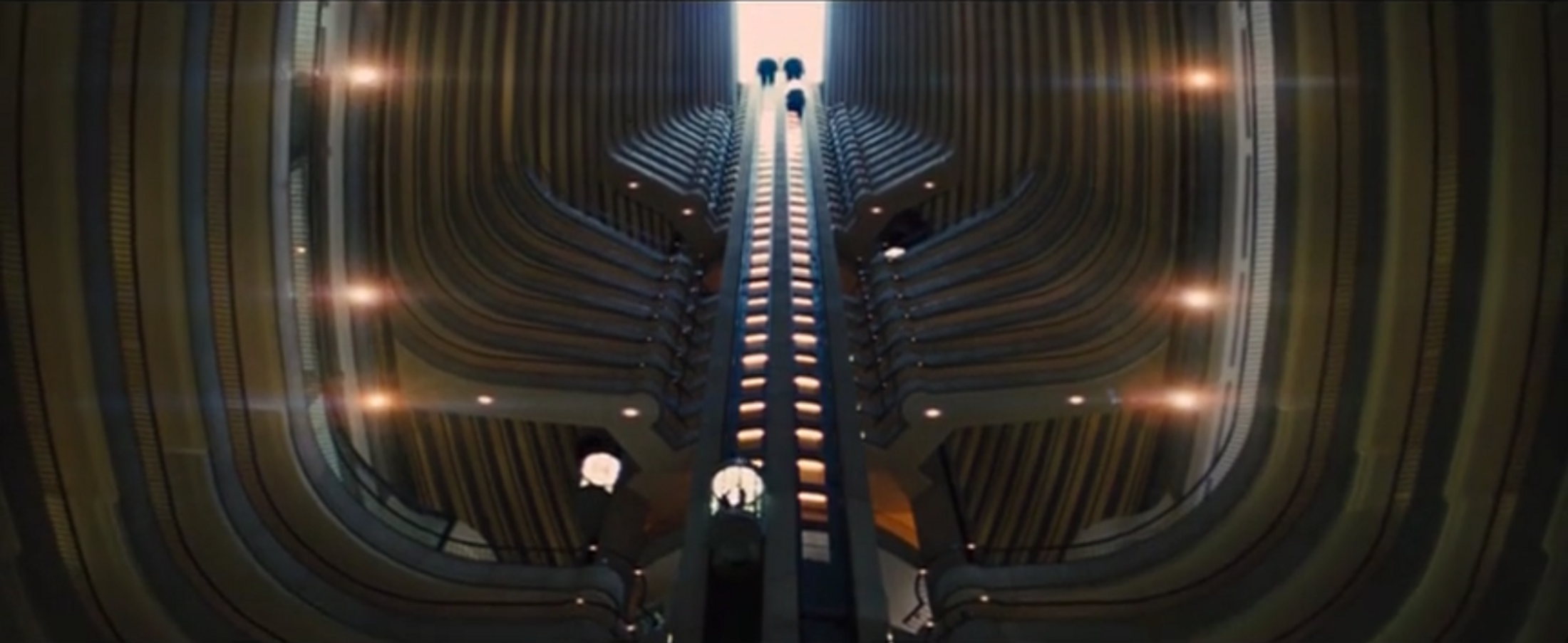 Par la grâce du montage, les étages ne correspondent d’ailleurs pas à la vue extérieure. Et c’est là l’occasion d’un des moments architecturaux les plus spectaculaires du film. Sortie sur une terrasse, Tris s’y trouve emprisonnée visuellement dans un tissu alvéolaire comme infini. Des tours, toutes similaires, aux fenêtres toutes égales, dont jailliront bientôt des assaillants, tous vêtus de noir – et devenus du même coup des figures par excellence de l’anonymat fantasmé par le film. Belle allégorie, en vérité.