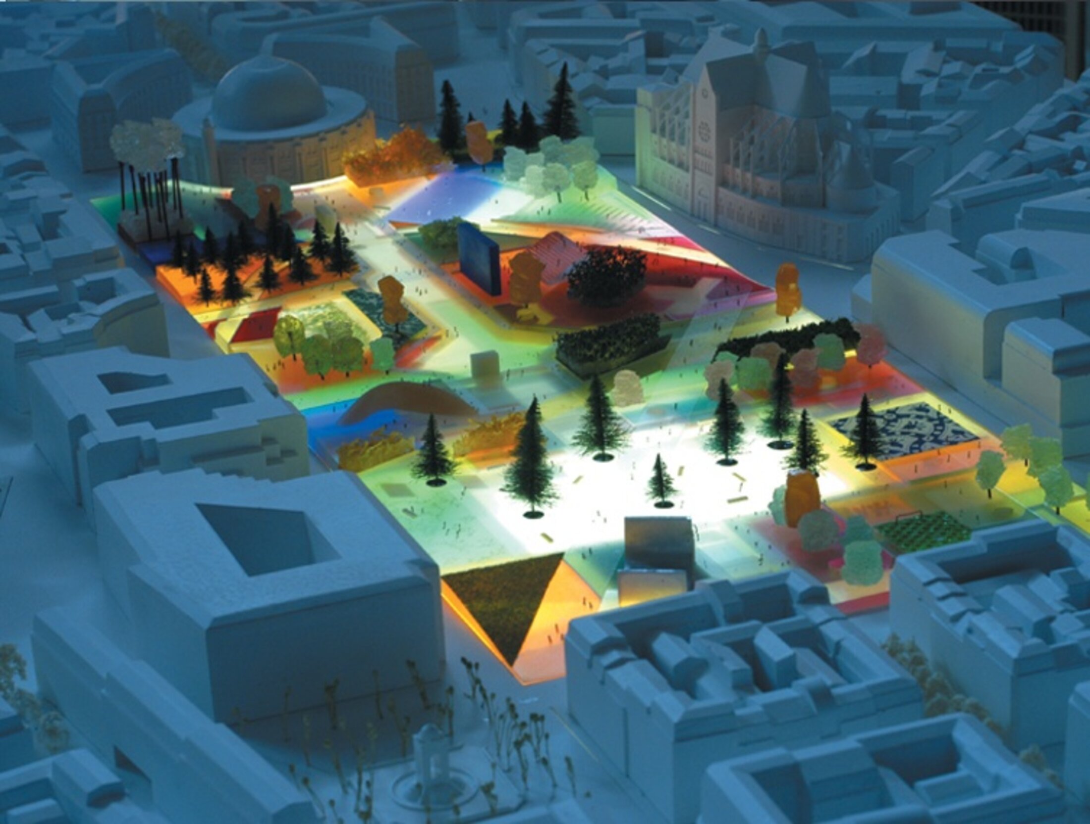 Notre verrière virtuelle, à vrai dire, ne manque pas d’antécédents. La pyramide du Louvre, pour commencer, qui ouvrait en profondeur une cour des plus centrales, des plus symboliques de la capitale. La mosaïque, surtout, proposée il y a de cela quelques années par MVRDV pour le réaménagement du site des Halles. Sur une grande partie de l’espace du jardin, les piétons auraient désormais glissé sur un gigantesque vitrail coloré, laissant largement profiter des entrailles labyrinthique du centre commercial et des gares. Les projets se survivent, réapparaissent, c’est bien connu. Winy Maas, responsable de MVRDV, avait rêvé pour sa part d’un « socle en attente d’un improbable monument » : Paris, décidé à modifier l’espace des Halles, ne savait encore quoi en faire. L’indécision s’est seulement déplacée. Soucieux d’image sans projet particulier, on s’est reporté, manque d’imagination aidant, sur la zone la plus emblématique de la ville… où le monument, à tout le moins, préexiste, et où, les architectes en sont conscients, il n’est nullement question de construire vraiment.