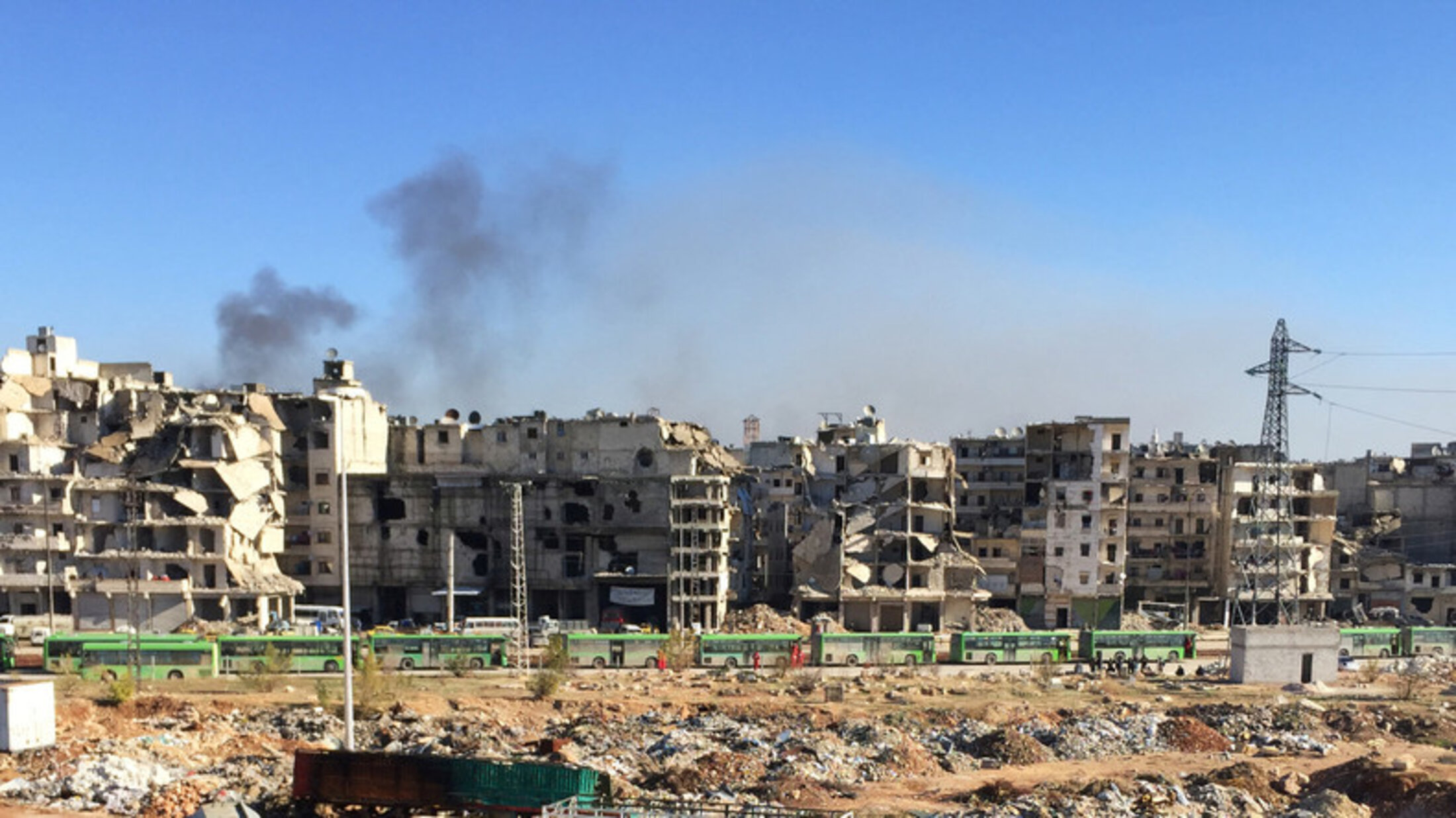 Une ligne d’autobus verts, traversant des rues en ruine, dans ce qui reste d’une ville. Seul trait véritable dans un ensemble qui paraît défait à tout jamais, et qui surprend lui-même par son ordre incongru. Il faudrait voir tout le reste, mais cela fait des mois, des années déjà, qu’on n’y parvient plus. Ne persiste que cette étendue indifférente à force de destruction, sans point de partage ni de reconnaissance. Cette indétermination, qu’une ligne de bus verts, soudain, ranime, rappelle au regard.
