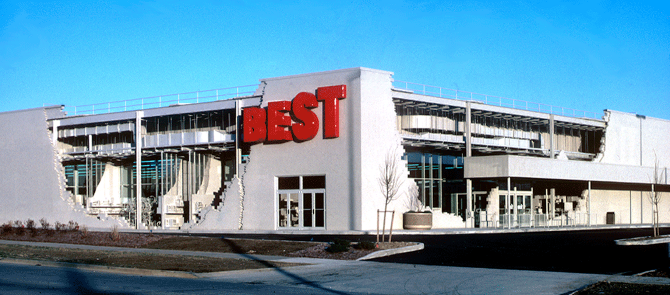 La rénovation du centre commercial de la Part-Dieu a dans l’histoire de l’architecture un modèle évident : la série des magasins BEST dessinée par James Wines et l’agence SITE dans les années soixante-dix. Le plus fameux voyait sa façade comme à moitié effondrée, réduite à un tas de briques. Un autre montrait de larges baies vitrées percées de telle manière qu’elles semblaient de sauvages trouées dans le mur du bâtiment…