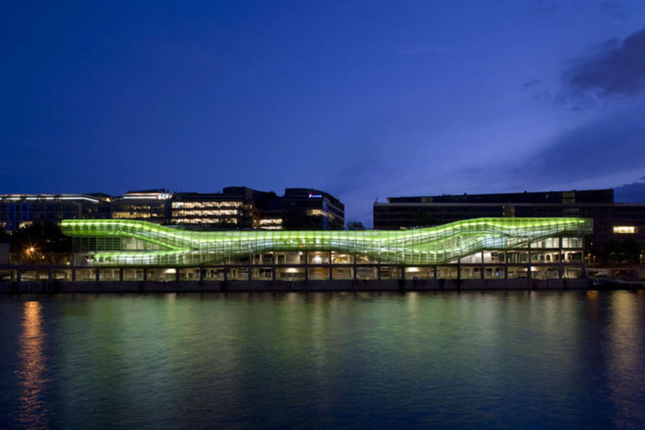 Et puis, on a fini par s’en apercevoir. En berge de Seine, devant l’utopie de cristal, est venue se poser la Cité de la Mode. Une résille verte, si verte, comme pour contrebalancer au maximum l’atonie de l’arrière-fond. Des bas plutôt chics : de l’autre rive, le spectacle est réjouissant. Et la Cité elle-même offre de sa terrasse un beau point de vue : les bureaux autour de la gare de Lyon, sur ligne de fleuve, y brillent de tous leurs feux, le soir.