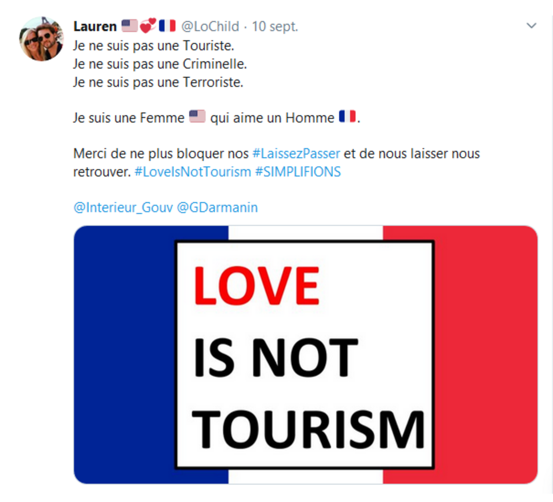 Le secrétaire d'État chargé du Tourisme, des Français de l'étranger et de la Francophonie avait annoncé le 8 août dernier une procédure dérogatoire pour permettre aux enfants et compagnons de Français non-mariés de se retrouver en France. Cinq semaines plus tard, la campagne #LoveIsNotTourismeFrance bat son plein. Sauf quelques couples aidés en haut lieu, par exemple par le député des français de l’étranger Roland Lescure (propos tenus ici), les extra-européens amoureux de français ne peuvent toujours pas les rejoindre .