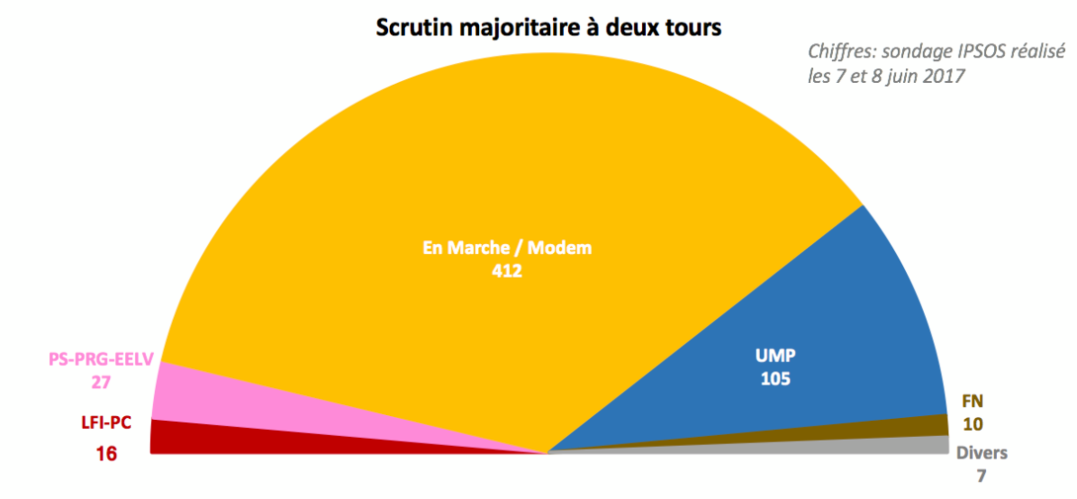 Les sondages prédisent au parti d'Emmanuel Macron et à ses alliés près de 31% des voix au premier tour de ces législatives... et plus de 400 députés élus in fine. Pour mémoire, l'UMP de Nicolas Sarkozy avait obtenu, au premier tour des législatives 2007, 46% des voix mais seulement 345 députés élus au second tour.
