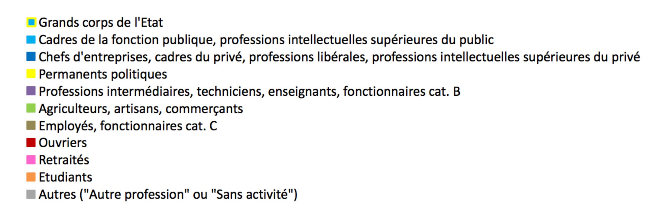 Les grands "sortants" (PS et ex-UMP) présentent un ensemble de candidats dont le profil n'est guère surprenant: les CSP+ y occupent une place prépondérante, avec une prédominance du public au PS et du privé à l'UMP. On notera la présence d'un nombre non négligeable de membres des "grands corps de l'Etat" ainsi que de "permanents politiques", sujet déjà évoqué dans un précédent article. Les autres catégories socio-professionnelles sont réduites à la portion congrue.