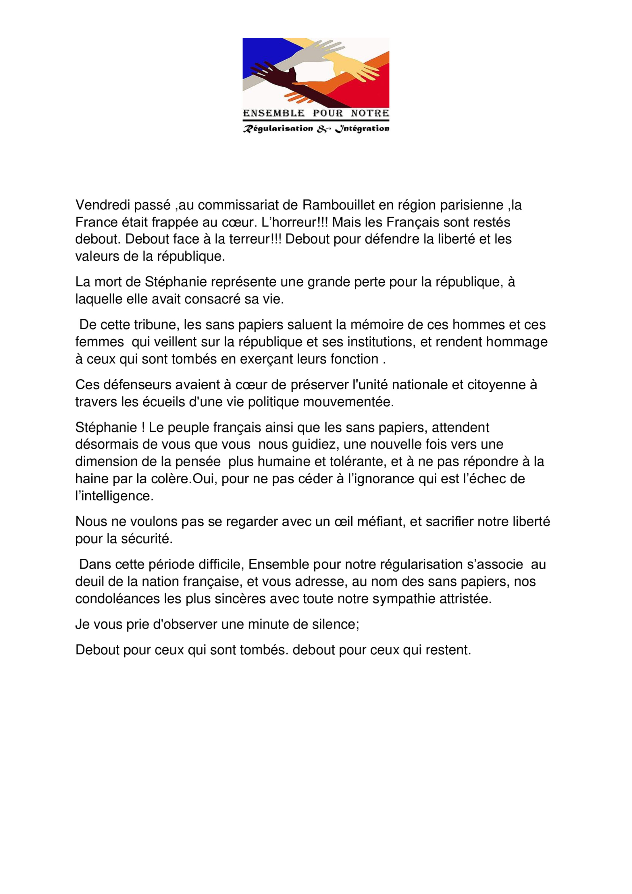 Vendredi passé ,au commissariat de Rambouillet en région parisienne ,la France était frappée au cœur. L’horreur!!! Mais les Français sont restés debout. Debout face à la terreur!!! Debout pour défendre la liberté et les valeurs de la République.
