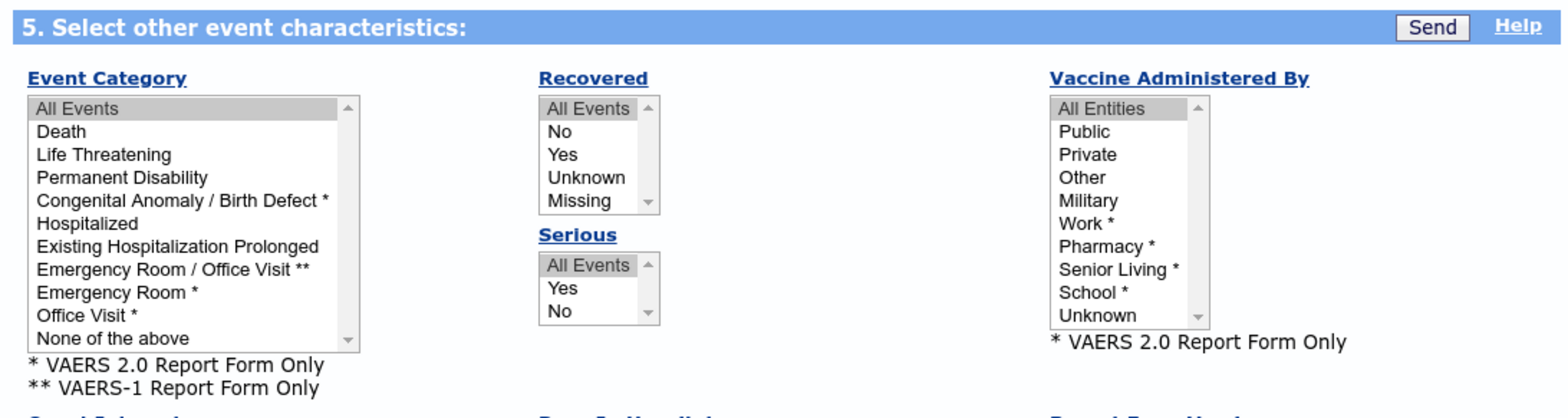 Si on fait une nouvelle demande de données, en cliquant sur "Request Form" (Fig.7), on peut facilement rectifier la requête dans le paragraphe 5 (Fig.6) : on peut par exemple sélectionner "Death" dans le menu "Event category" puis cliquer sur "Send", ce qui sélectionnera uniquement les événements indésirables conclus par un décès. Une autre possibilité serait de ne chercher que les événements graves, en laissant "All Events" dans le menu "Event category", mais en sélectionnant "Yes" dans le menu "Serious".