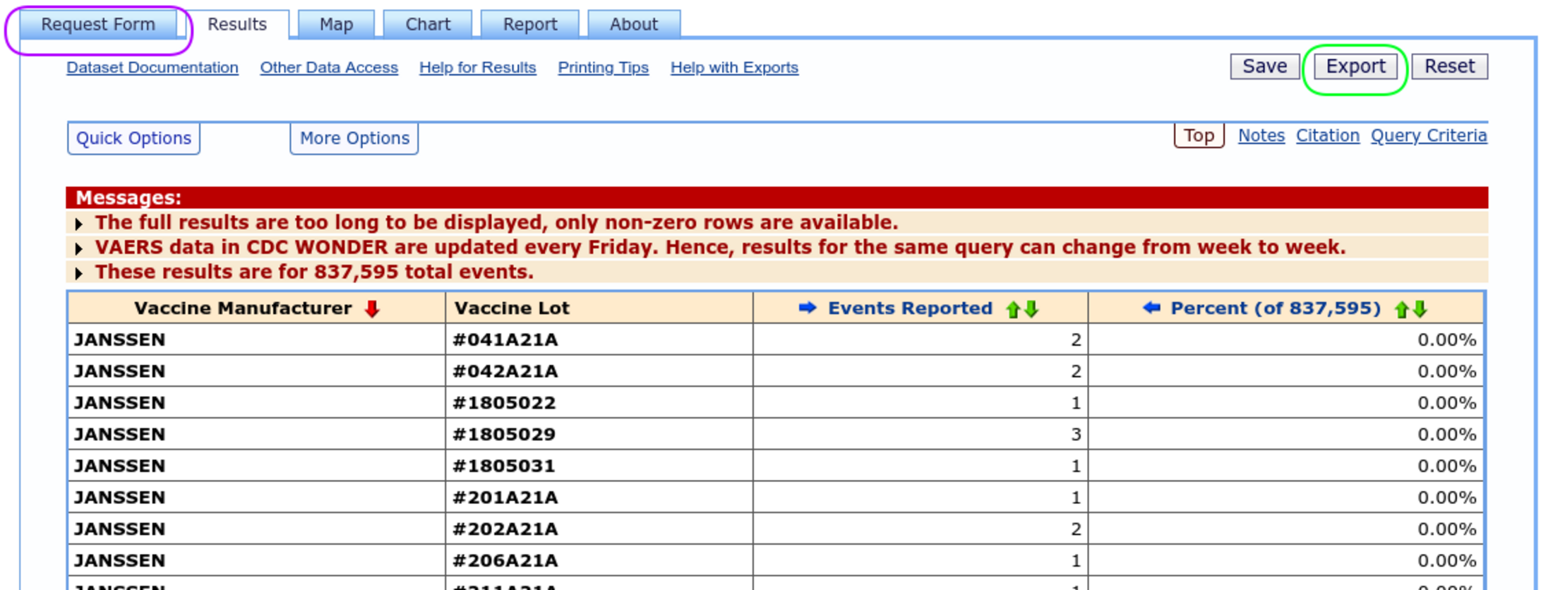 On peut l'examiner tel qu'il est affiché, ou le télécharger en cliquant sur "Export" (Fig.7), ce qui permet ensuite de travailler sur les données (en les triant, par exemple.) Dans le cas de la demande de "tous les événements" en provenance des USA et d'ailleurs ("All Locations"), sur les 3 vaccins anti-Covid, le résultat prévient que tout n'est pas affiché sur la page, et qu'il y a 837 595 événements enregistrés (résultat affiché le 01/11/2021).